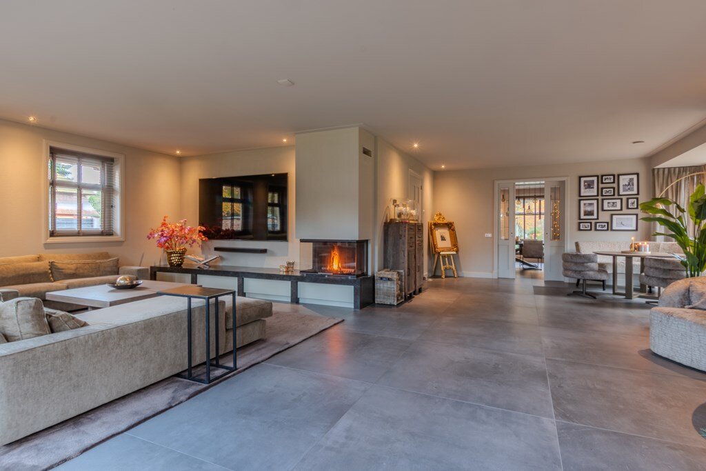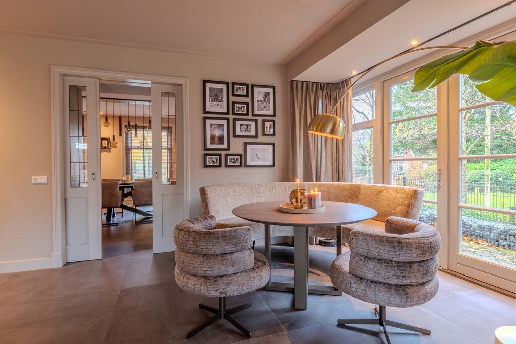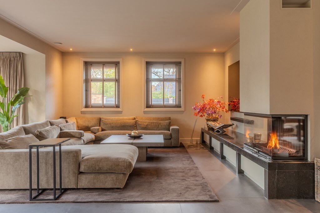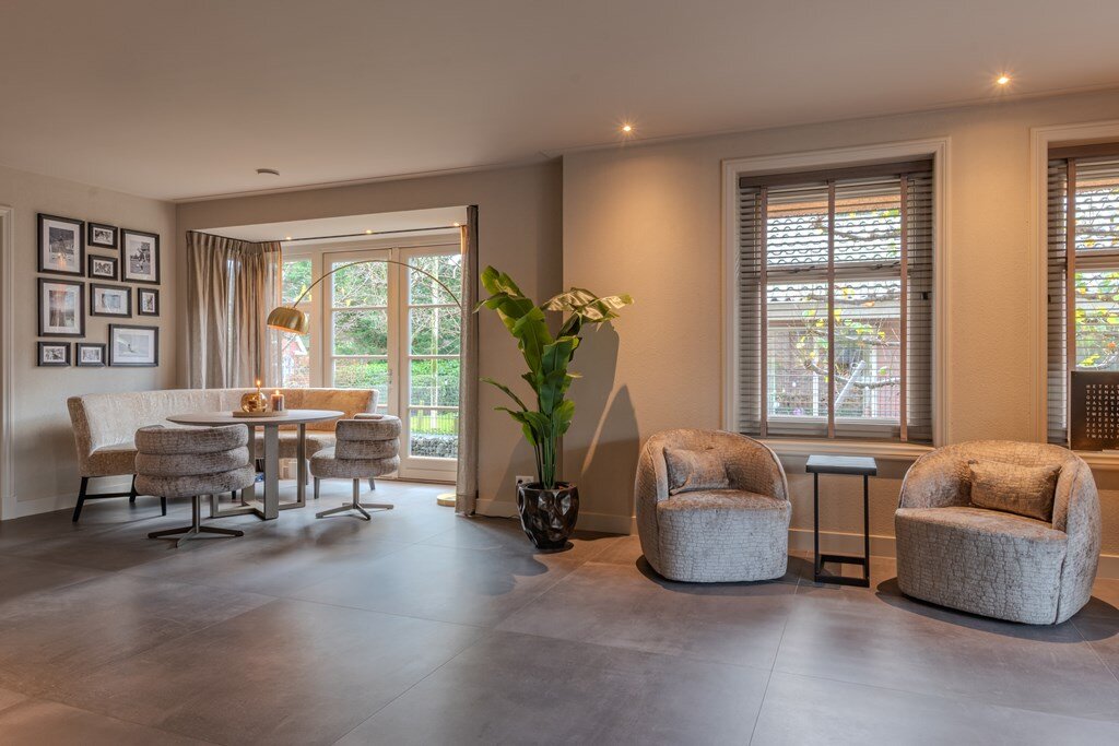 The living room is a generously proportioned, light-filled space with large windows that provide beautiful natural daylight. The seating area is arranged around the open fireplace, with a comfortable lounge sofa. Additionally, there are two extra seating areas and an intimate round table—perfect for cozy dinners or additional seating. Subtle window treatments and warm tones enhance the inviting atmosphere. From every angle, you enjoy stunning views of the garden, and the French doors open directly onto the terrace, seamlessly blending indoor and outdoor living.
