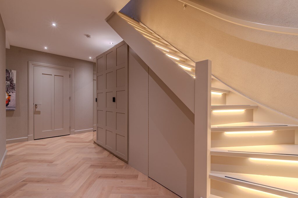Upon entering, you are greeted by a spacious, bright hallway that immediately evokes a sense of grandeur. The hall includes a toilet, meter cupboard, wardrobe closet, and a staircase to the lower level. Thanks to the high ceilings, mezzanine, subtle mood lighting, and elegant finishes, the entrance feels warm and inviting.