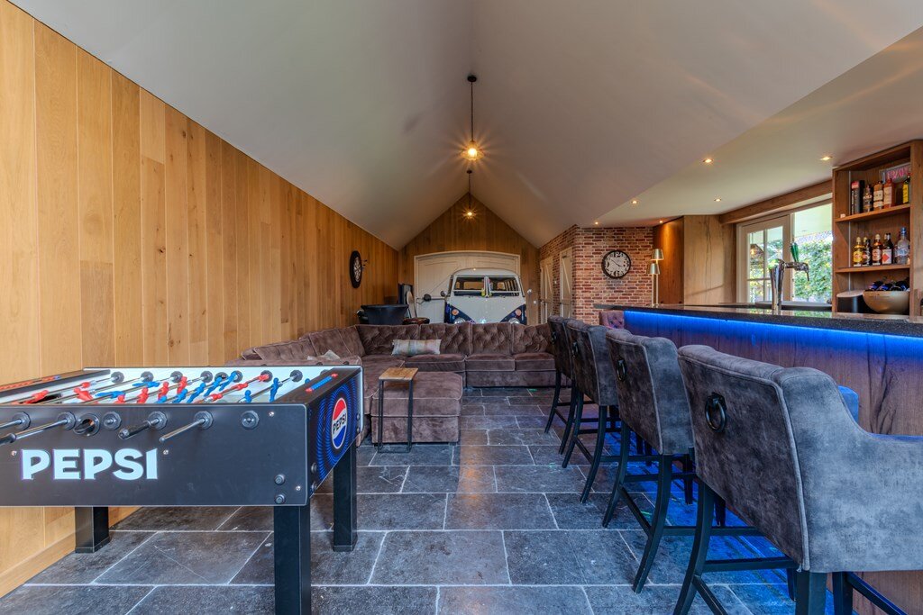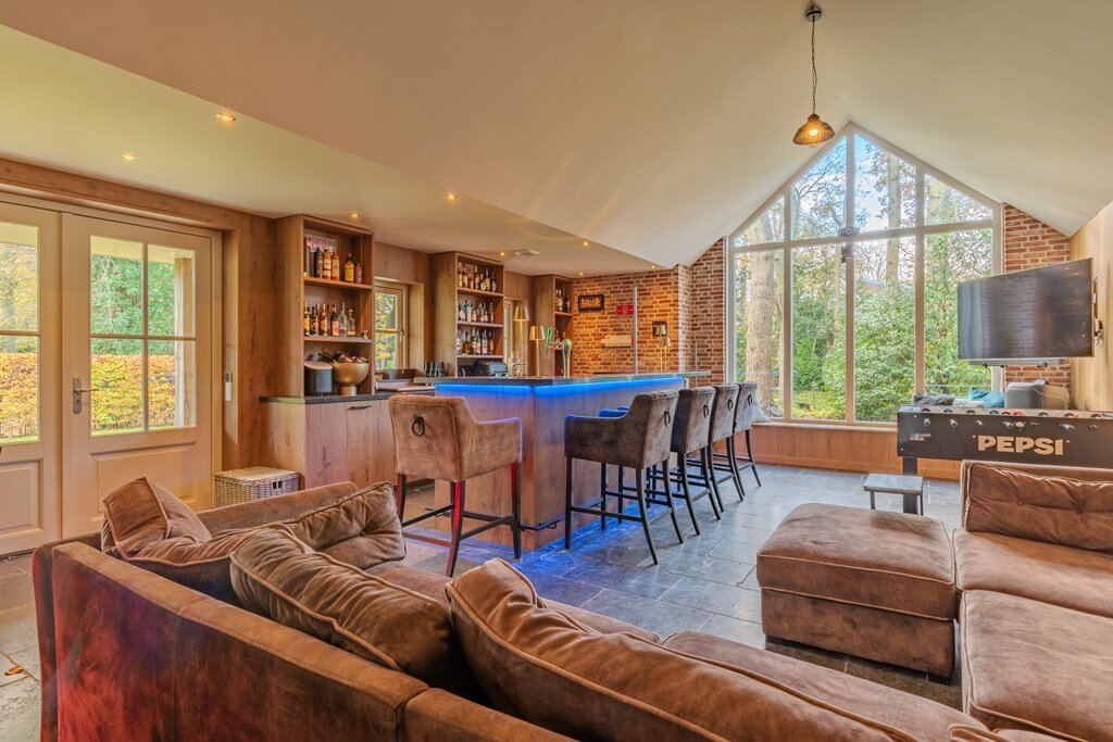 The garden house is a true highlight: it features a fully equipped bar, its own toilet facilities, French doors allowing for car storage, and a separate space for a workbench and gardening tools. The covered terrace and veranda make year-round outdoor lounging possible around the gas fireplace, making this home ideal for hosting and offering ample space for everyone. The deep rear garden is surrounded by tall trees, enhancing the sense of woodland living.
