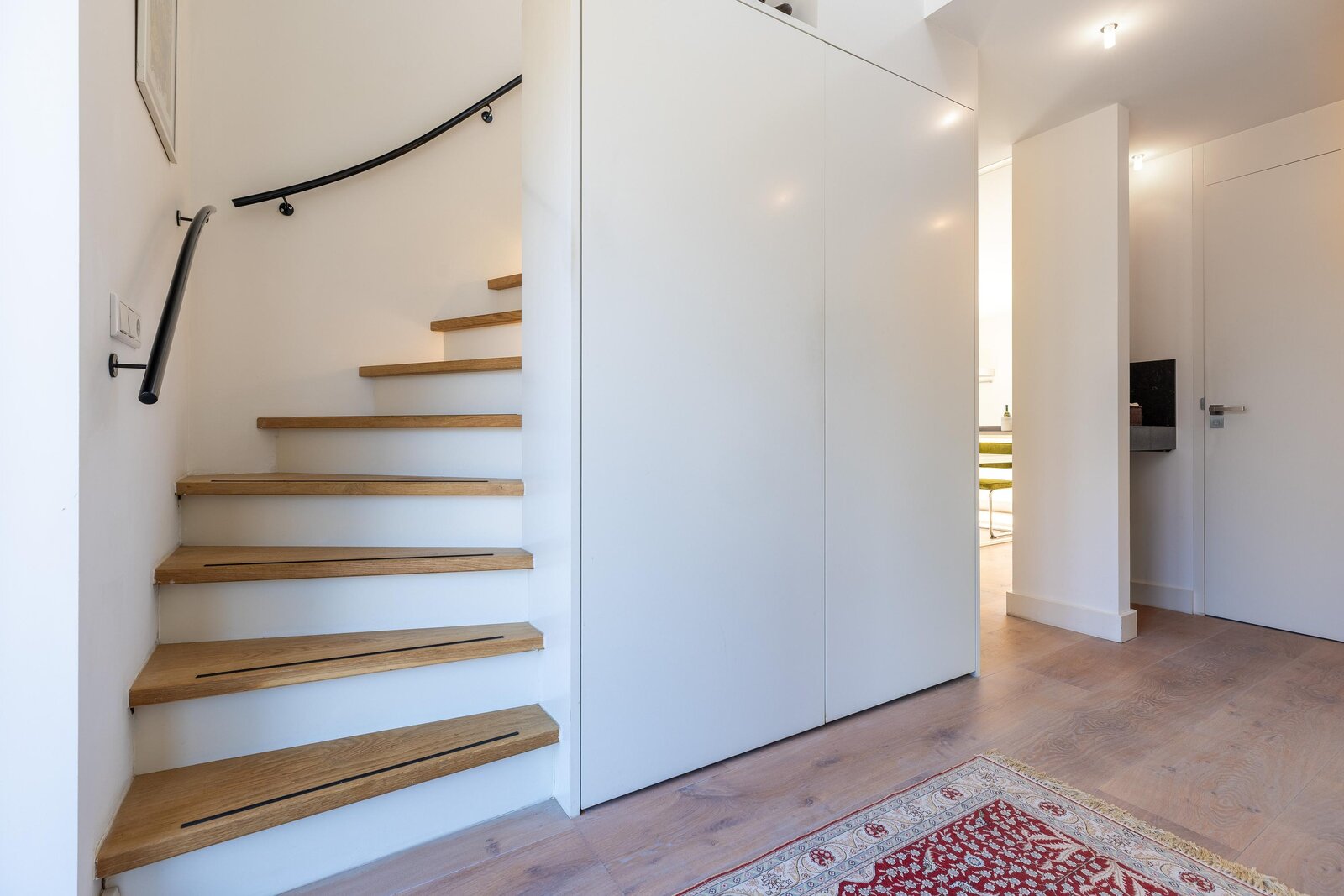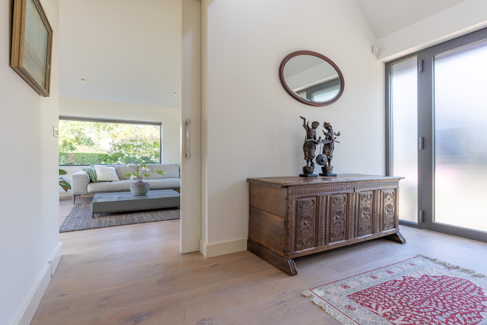 Ruime entree met vide en trapopgang naar eerste etage, garderobe, en toilet met fontein, doorgang naar de ruimtelijk opgezette woonkamer met een hoge vide en grote ramen waardoor als u naar buiten kijkt een prachtig dorpsgezicht ziet.