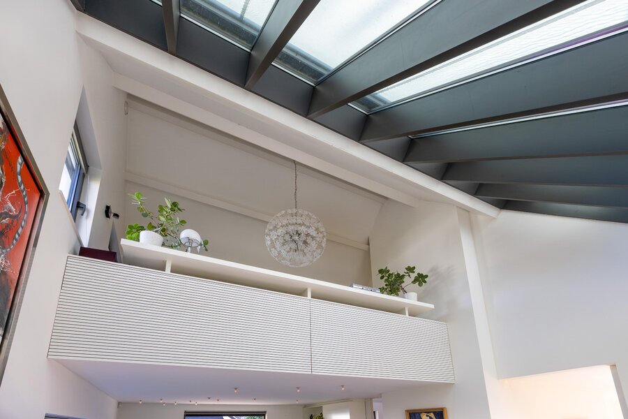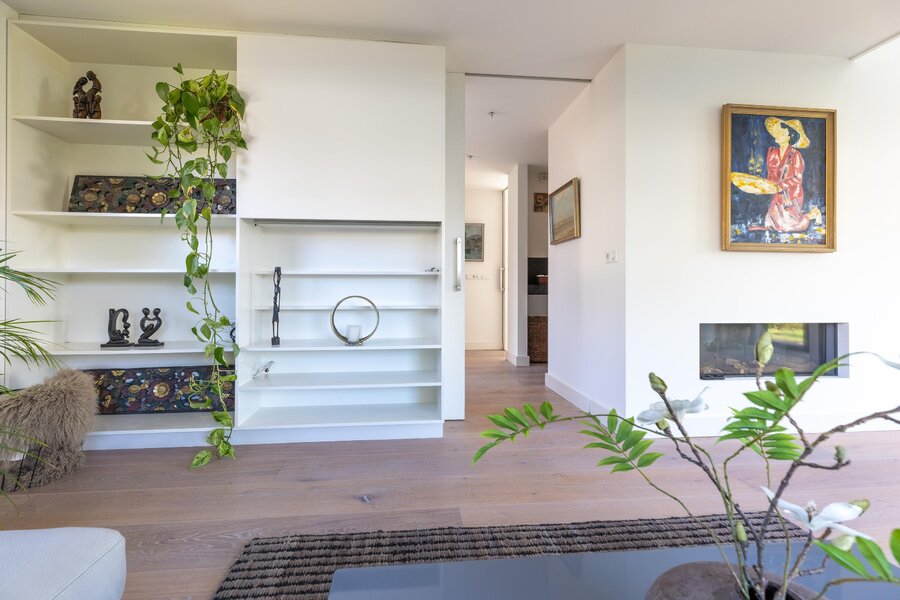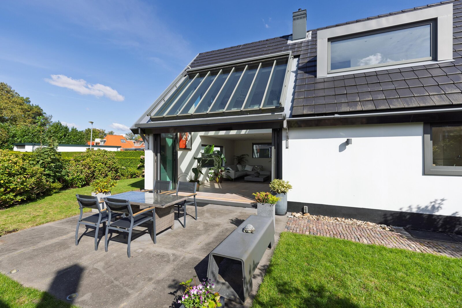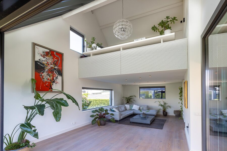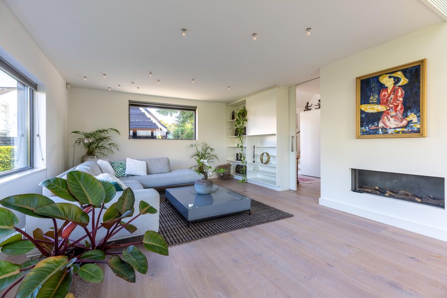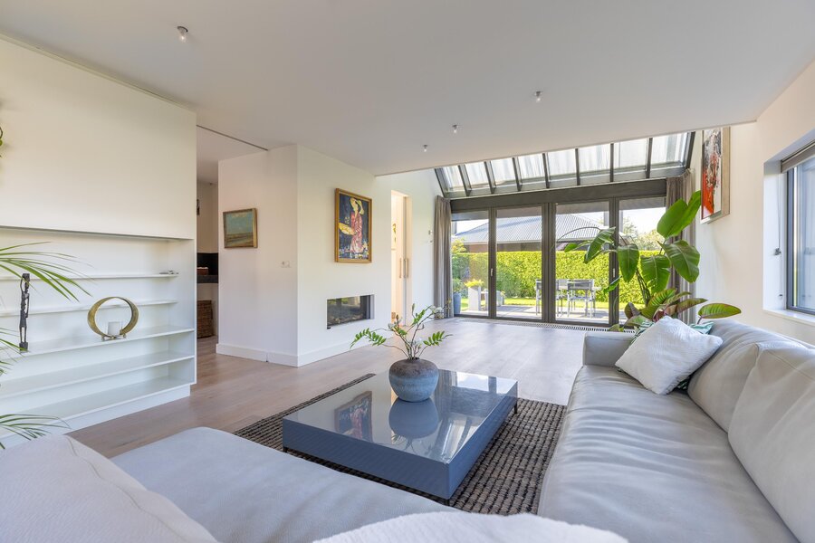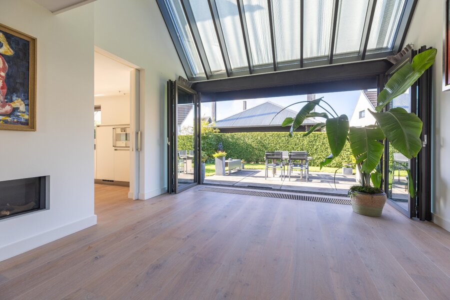De woonkamer is verder voorzien van een brede gashaard en de achtergevel kan in zijn geheel geopend worden.