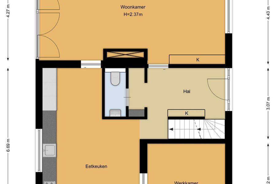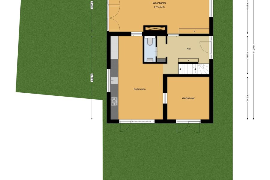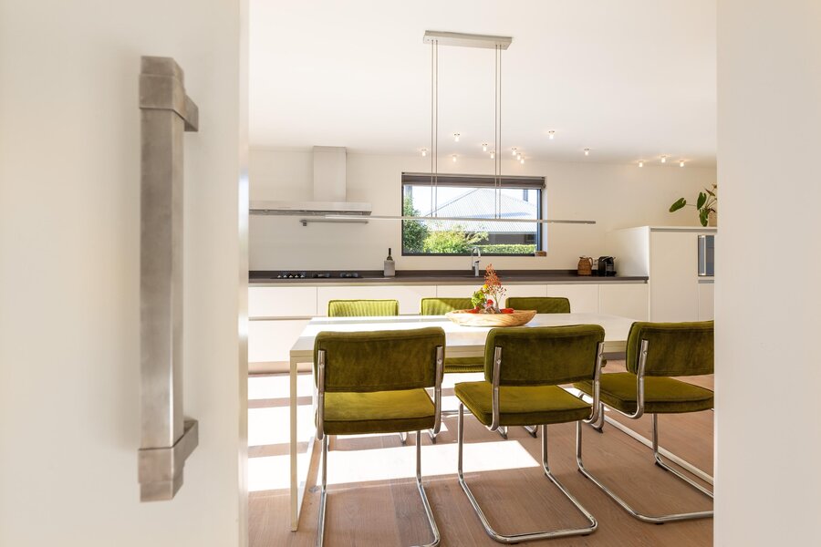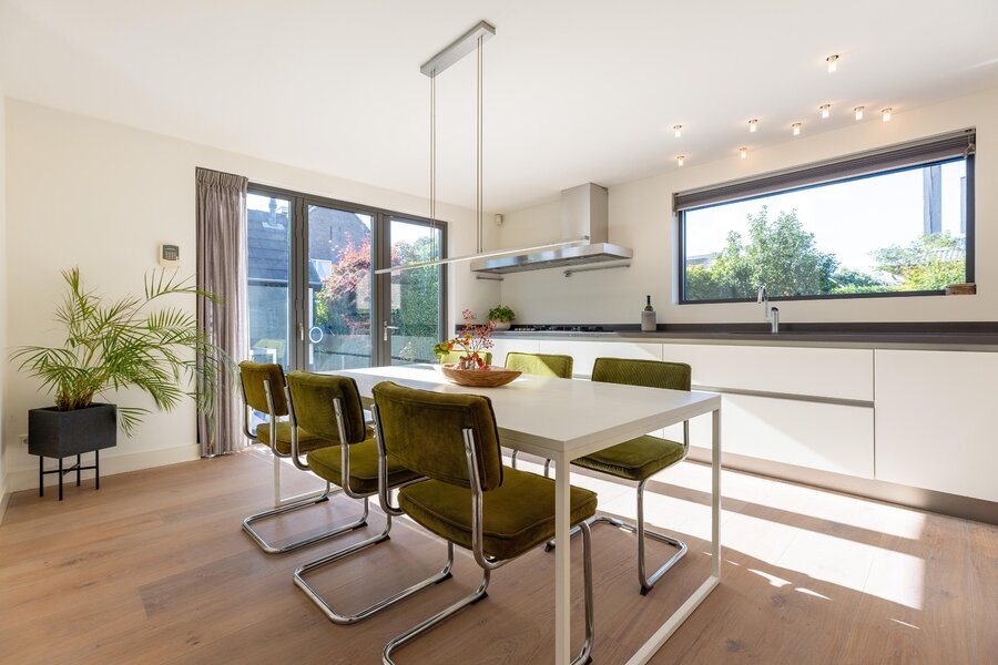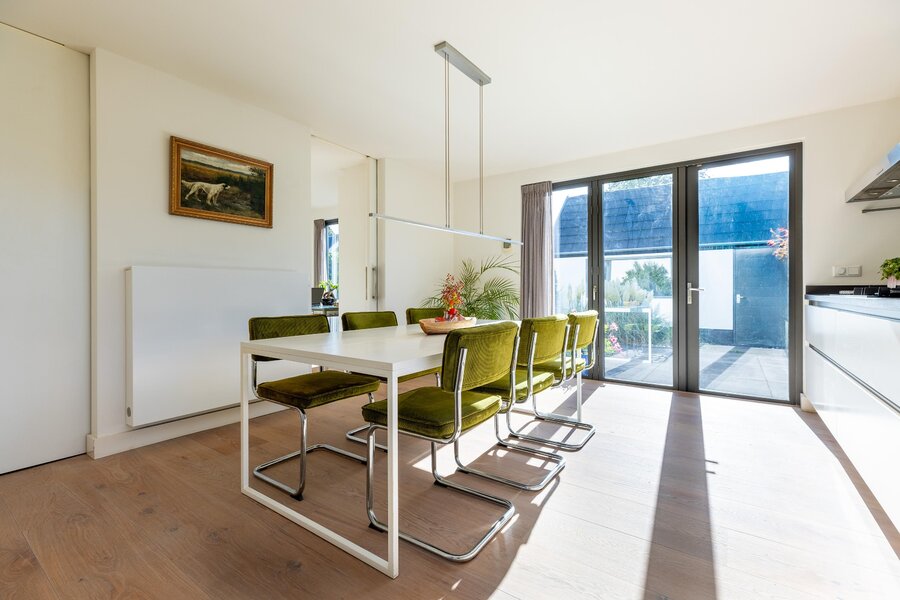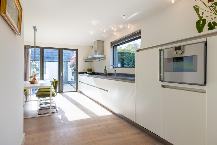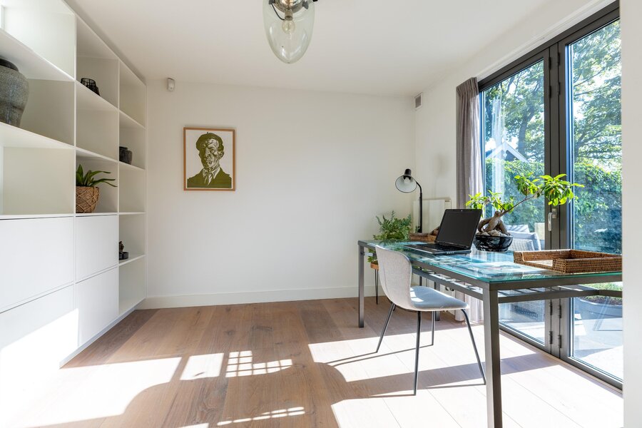 De keuken is ruim opgezet met diverse apparatuur en heeft een vouw-/schuifpui naar het zijterras. Tevens is hier de entree naar de werkkamer/slaapkamer.