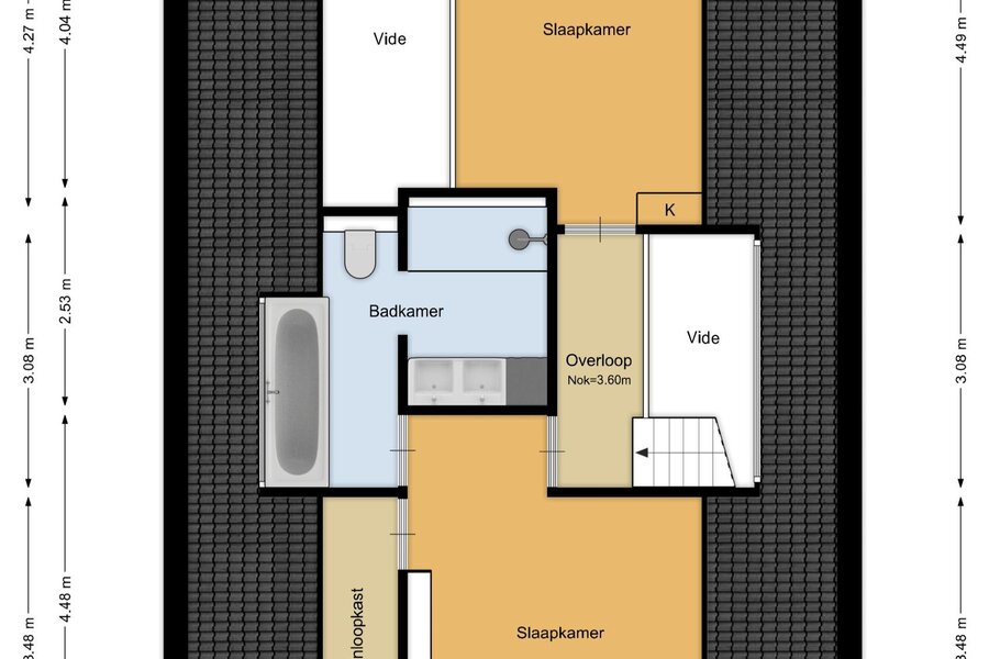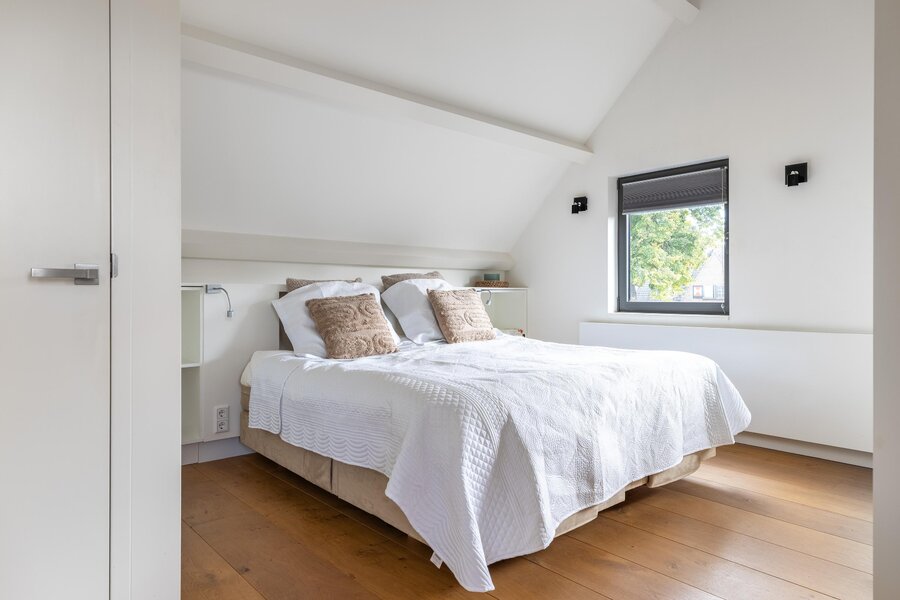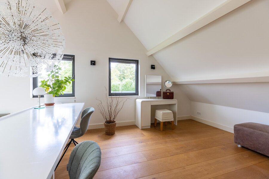 Overloop, één grote slaapkamer met inloopkast en inpandige badkamer voorzien van ligbad, toilet, dubbele wastafel en inloopdouche.