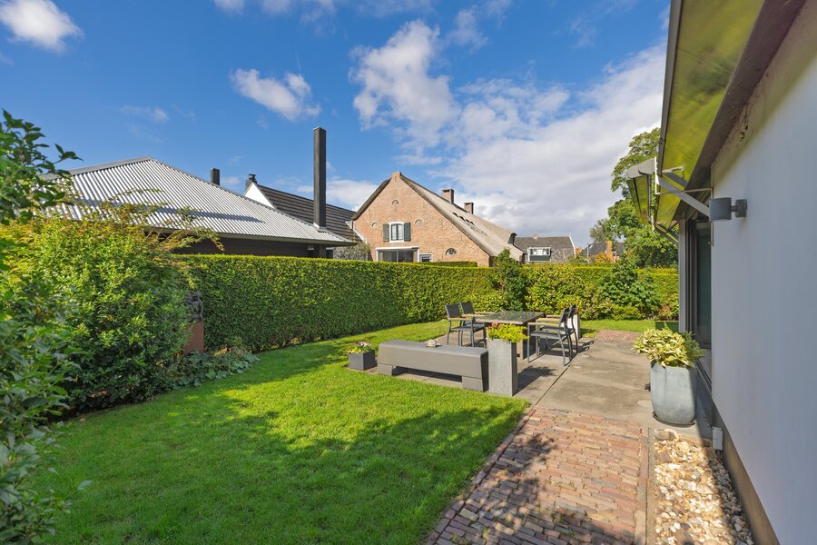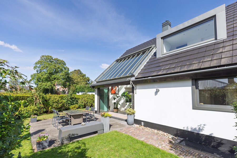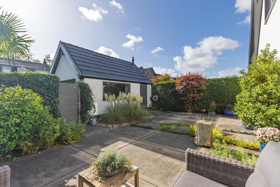 De zijtuin en achtertuin hebben een ideale ligging op het zuiden en het westen. Beide terrassen bieden veel privacy.
