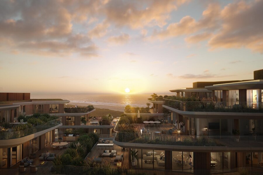 - The residences feature floor-to-ceiling sliding doors with seamless access to sheltered terraces.