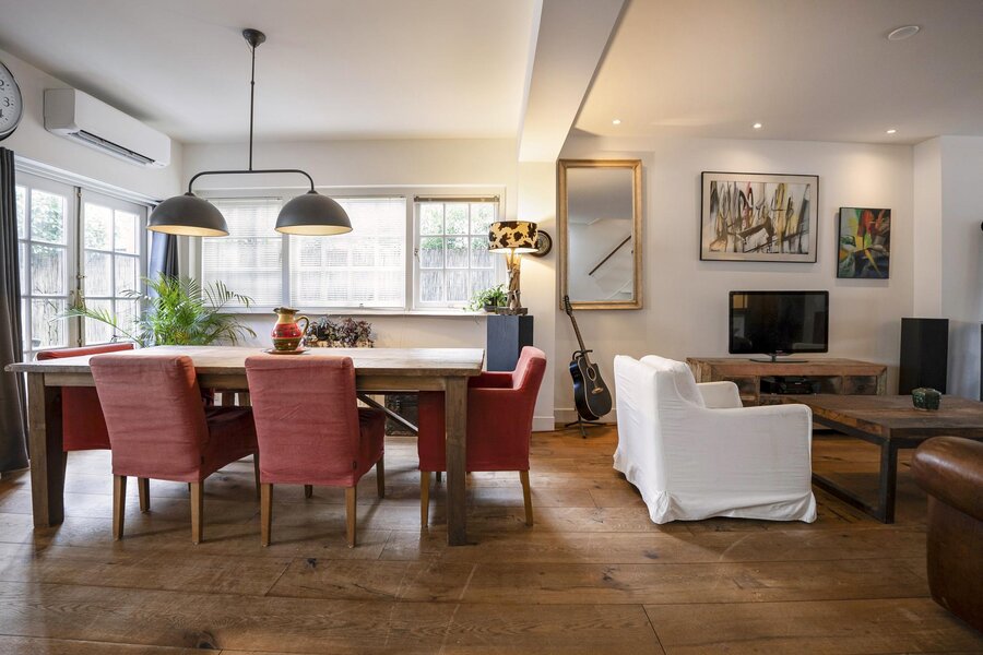Entree in de hal met meterkast, aparte wc en toegang naar de royale woonkamer met airconditioning. De gehele begane grond is voorzien van een prachtige houten vloer. Trap naar de eerste verdieping. Aan de achterzijde is de woning uitgebouwd en bevindt zich de eetkamer met openslaande deuren naar de achtertuin.