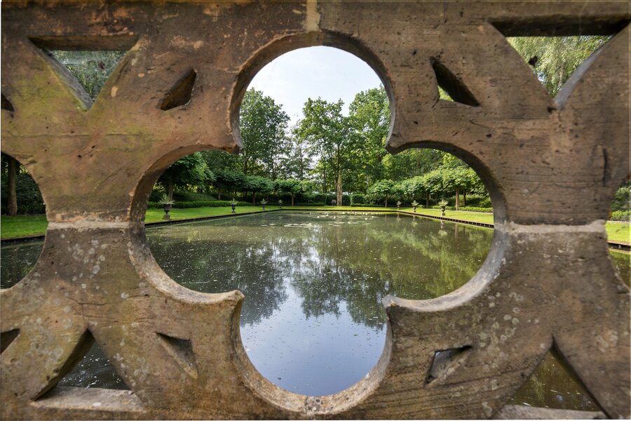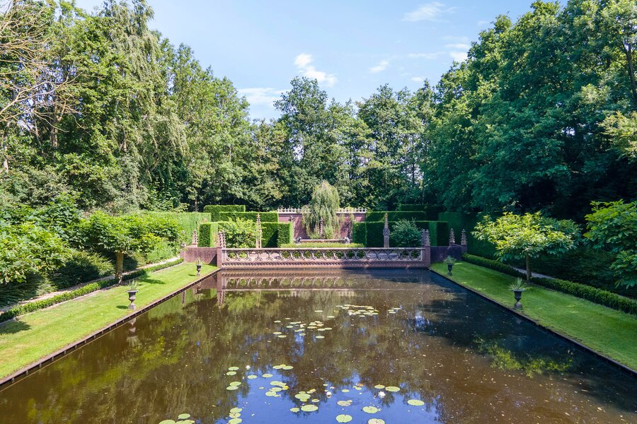 De tuin is rijk aan verrassingen: twee (zwem)vijvers, terrassen, tuinhuizen, serre met moestuin, bospercelen en graslanden. De formele vijver is omlijst met elementen van de Dominicuskerk aan de Spuistraat te Amsterdam. De waterpartijen worden gevoed met water uit de naastgelegen vaart.