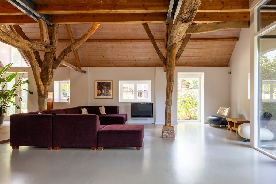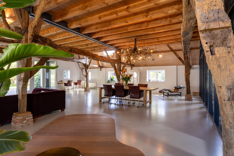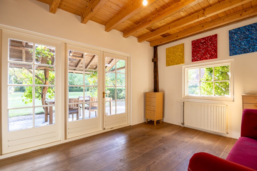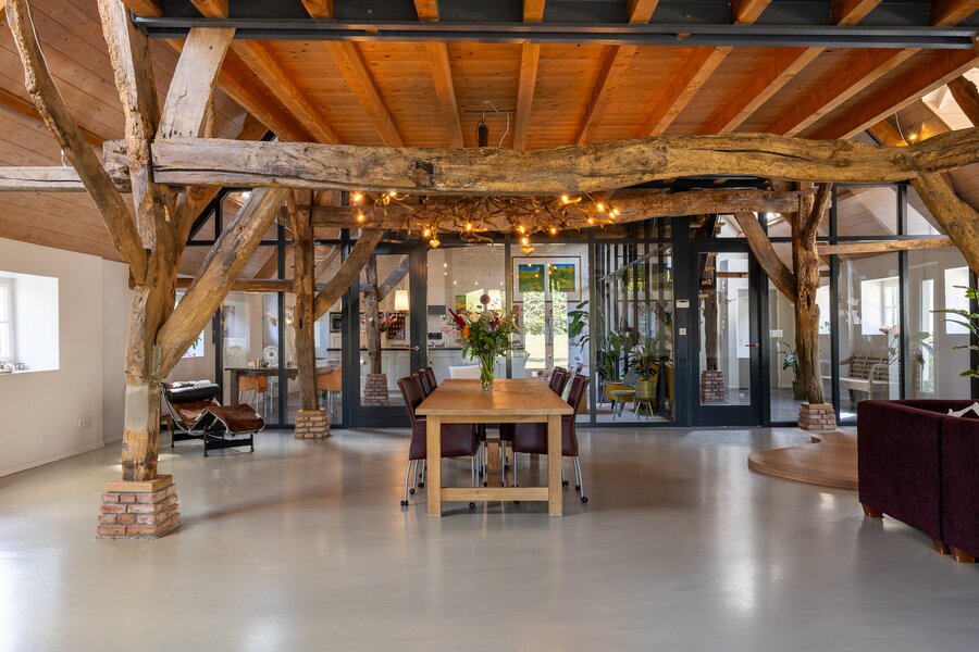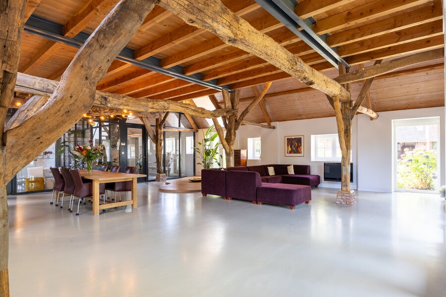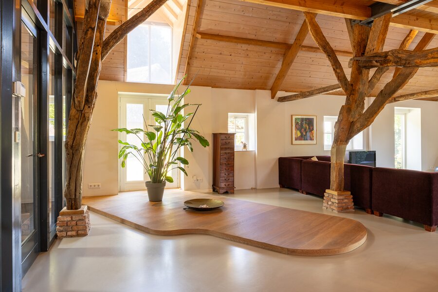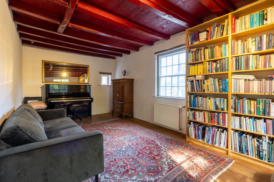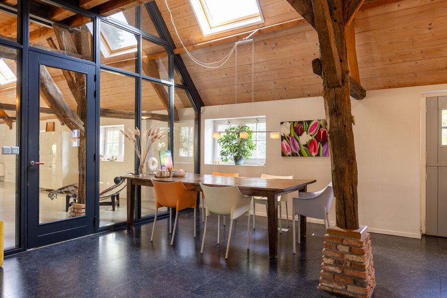 De woonkamer ademt een warme, gerenoveerde sfeer, waarbij de authentieke houten balken prachtig behouden zijn gebleven en stijlvol in het geheel zijn geïntegreerd. De ruimte is afgewerkt met een betonnen gietvloer en biedt daarnaast plaats voor een tweede eethoek. Dankzij de aanwezige dakramen en de vele raampartijen komt er volop natuurlijk licht naar binnen, wat de ruimte een open en lichte uitstraling geeft. Een bijzonder detail is het podium, waar voorheen een vleugel stond opgesteld. Via de grote pui heeft u bovendien direct toegang tot de tuin.