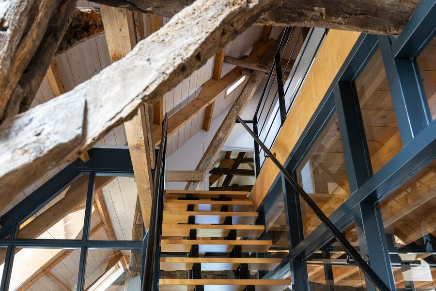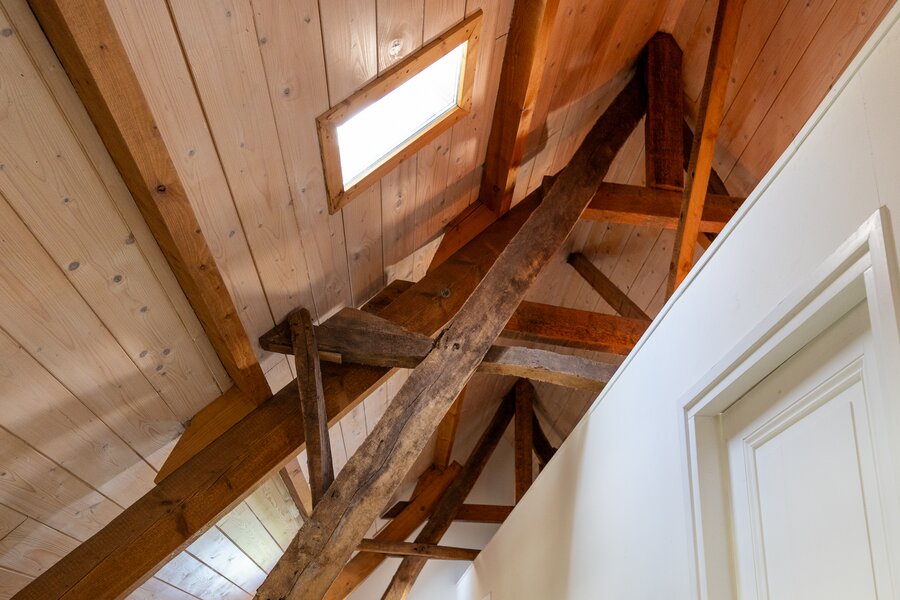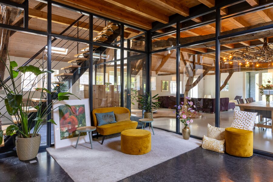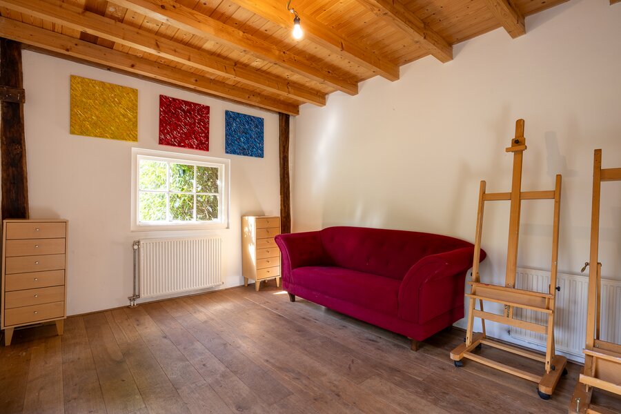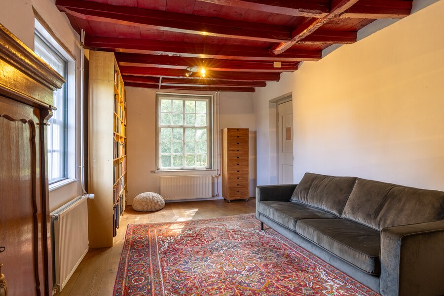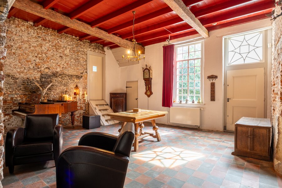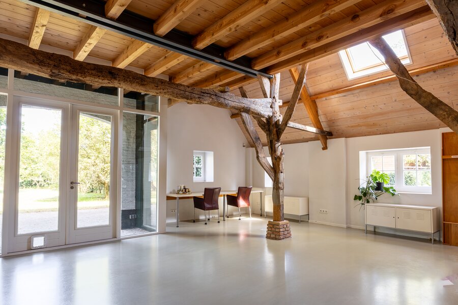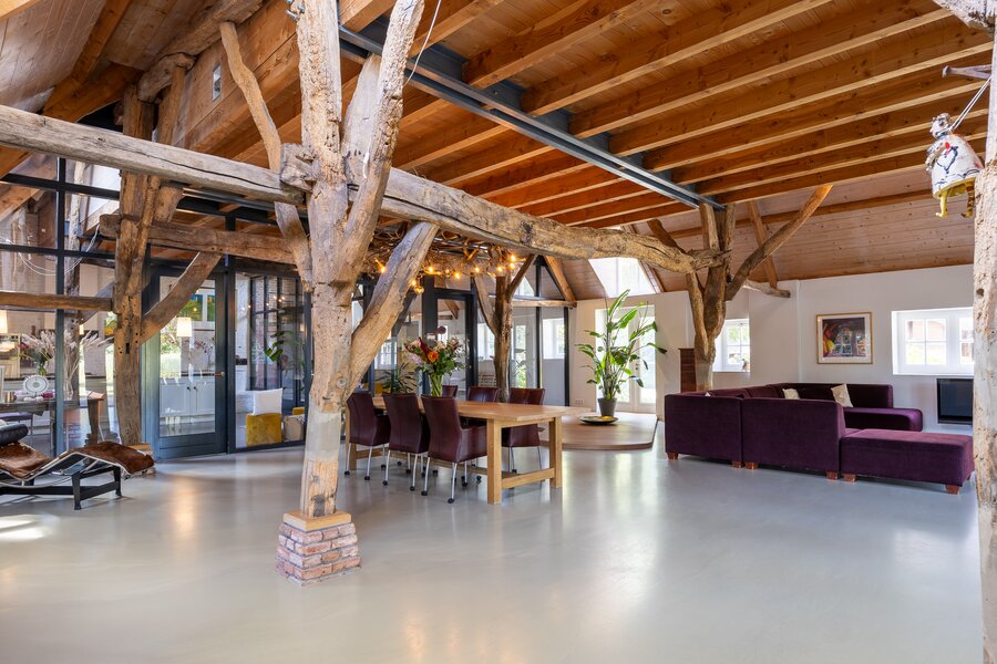 De woonkamer ademt een warme, gerenoveerde sfeer, waarbij de authentieke houten balken prachtig behouden zijn gebleven en stijlvol in het geheel zijn geïntegreerd. De ruimte is afgewerkt met een betonnen gietvloer en biedt daarnaast plaats voor een tweede eethoek. Dankzij de aanwezige dakramen en de vele raampartijen komt er volop natuurlijk licht naar binnen, wat de ruimte een open en lichte uitstraling geeft. Een bijzonder detail is het podium, waar voorheen een vleugel stond opgesteld. Via de grote pui heeft u bovendien direct toegang tot de tuin.
