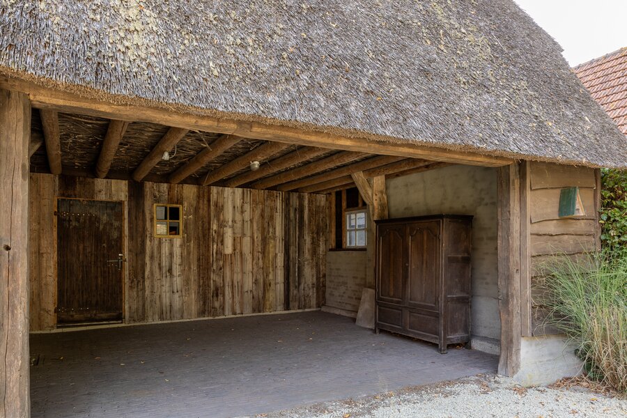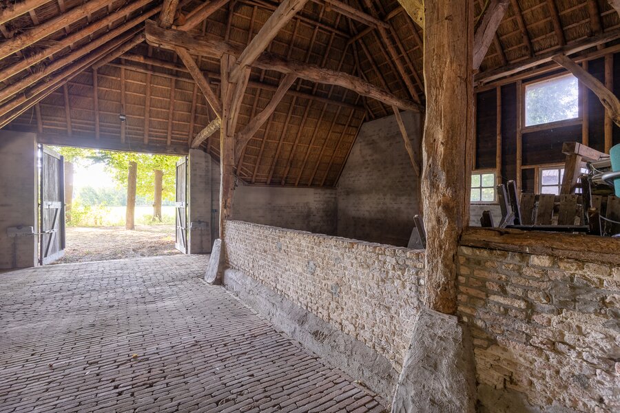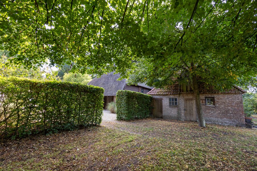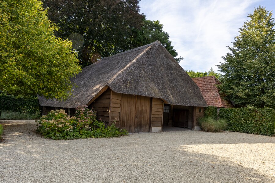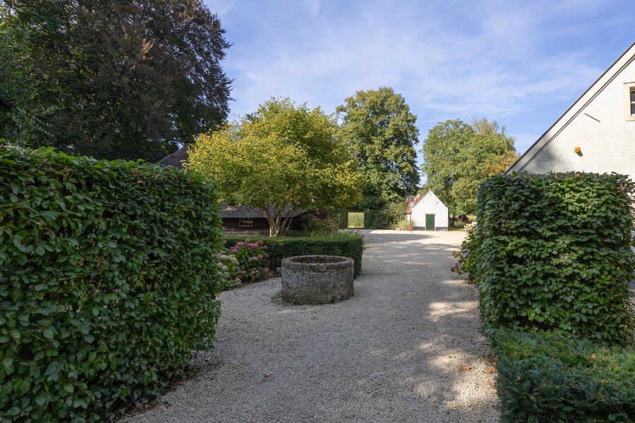 Via een elektrisch bediende witte poort betreedt u het terrein. In het verlengde van de oprijlaan bevindt zich de binnenplaats van het perceel. Hier vallen direct enkele bijzondere elementen op, zoals de historische waterput, de gerenoveerde Vlaamse schuur, het achterhuis dat momenteel dienstdoet als opbergruimte en het karakteristieke bakhuisje. De binnenplaats is volledig bestraat met grind en omgeven door volwassen groen, wat de verschillende gebouwen op natuurlijke wijze met elkaar verbindt.