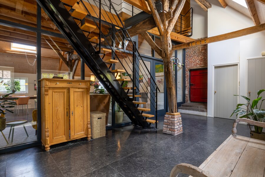 Bij binnenkomst in de hal ervaart u direct een ruimtelijk gevoel, dankzij de hoge plafonds en het natuurlijke licht dat via de dakramen naar binnen valt. Wat meteen opvalt zijn de glazen raampartijen rondom de keuken, die een prachtige doorkijk bieden naar de gehele woning. Aan de linkerzijde bevindt zich de woonkamer, voorzien van een eigentijdse gietvloer, terwijl de hal en de keuken met elkaar verbonden zijn door de natuurstenen vloer. Verder beschikt de hal over een vaste trap naar de eerste verdieping en een toiletruimte aan de rechterzijde van de voordeur. Vanuit de hal bereikt u bovendien de bijzondere herd, dat aan de voorzijde van het gebouw is gesitueerd.