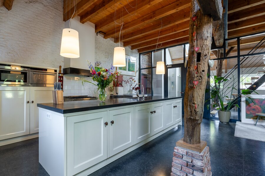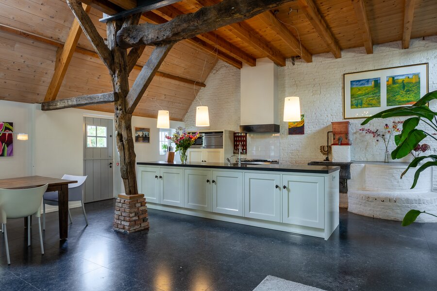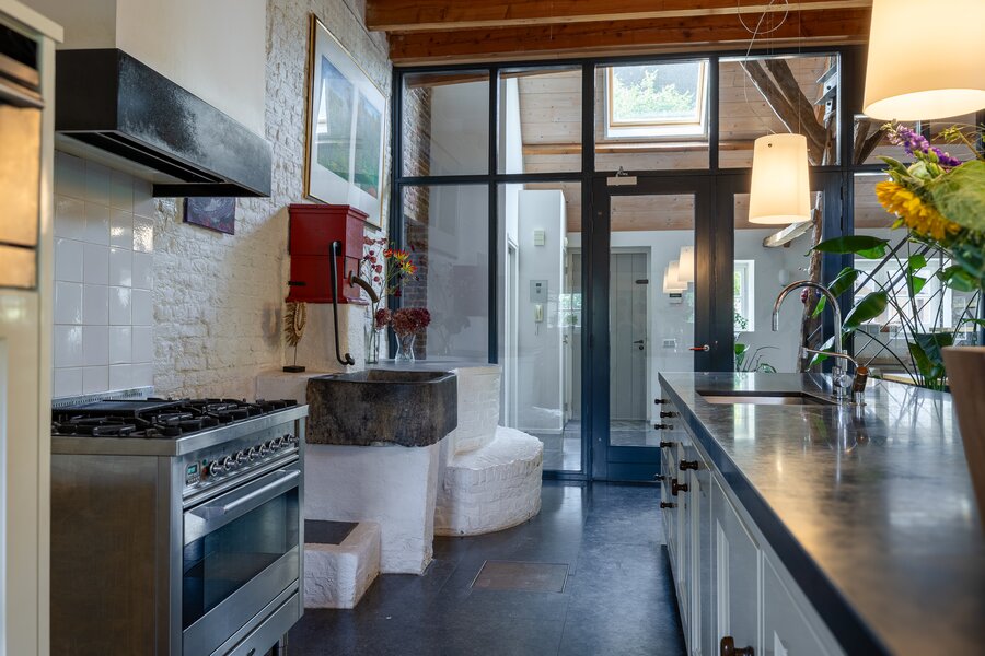 De keuken is een echte eyecatcher. Door de historie nog een beetje in beeld te houden vindt u hier een prachtige natuurstenen trog die nog altijd handmatig werkt via een waterput en waterpomp. Daarnaast beschikt de keuken over een kookeiland met natuurstenen blad, wasbak, Quooker, twee koelkasten met vriesvakken, magnetron, twee ovens, zes gaspitten, afzuigkap én voldoende ruimte voor een eethoek. De keuken is stijlvol afgescheiden met grote raampartijen die zorgen voor een open en lichte sfeer. Aan twee zijden geven deuren toegang tot de woonkamer en de hal.