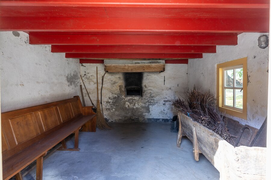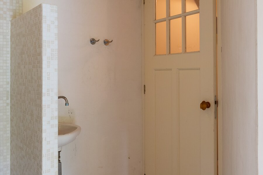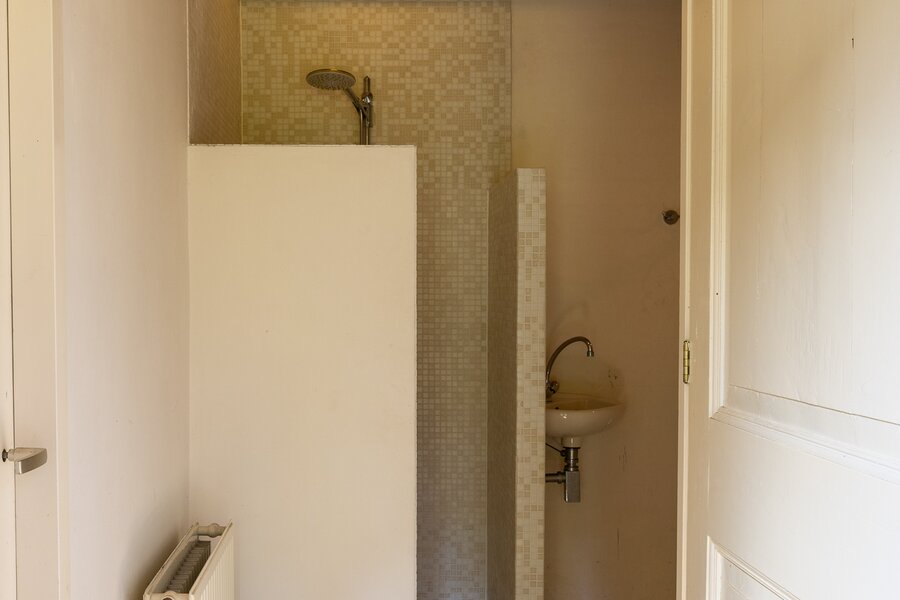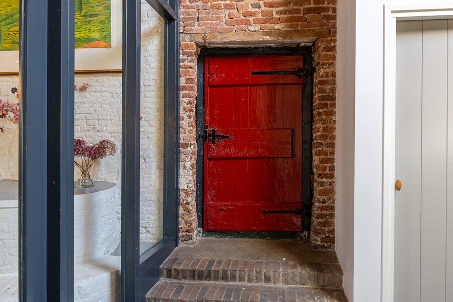 Naast deze historische elementen biedt de herd ook praktische functies. Zo is er een tweede voordeur aanwezig die direct toegang geeft tot buiten. Daarnaast grenst de bijkeuken aan deze ruimte, waar de aansluitingen voor witgoed zijn gesitueerd en eveneens een buitendeur aanwezig is.