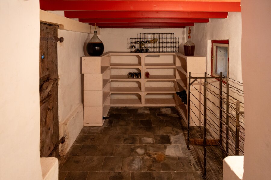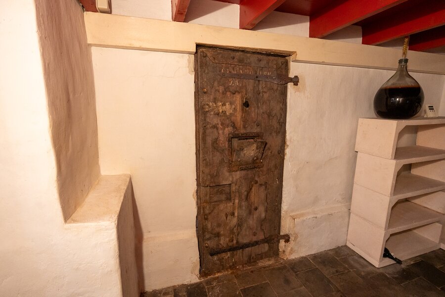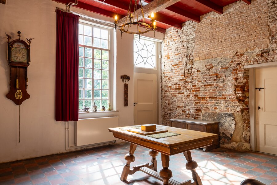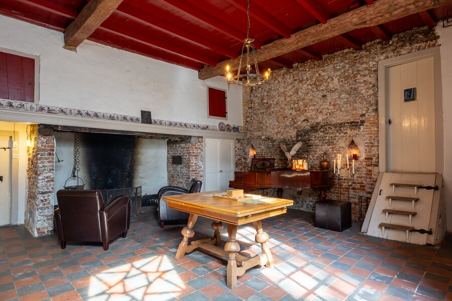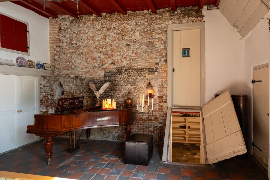 Aan de voorzijde van het hoofdverblijf bevindt zich de herd, een ruimte die bijdraagt aan het historische karakter van de woning. Blikvanger is de grote houthaard, die deze plek van oudsher warmte en sfeer gaf. Vanuit de herd leidt een opstap naar de opkamer met uitzicht op de tuin, voorzien van een massieve houten vloer. Deze opstap functioneert tegelijkertijd als toegang tot de wijnkelder, waar een oude gevangenisdeur een bijzonder en authentiek detail vormt dat de rijke historie van de woning benadrukt.