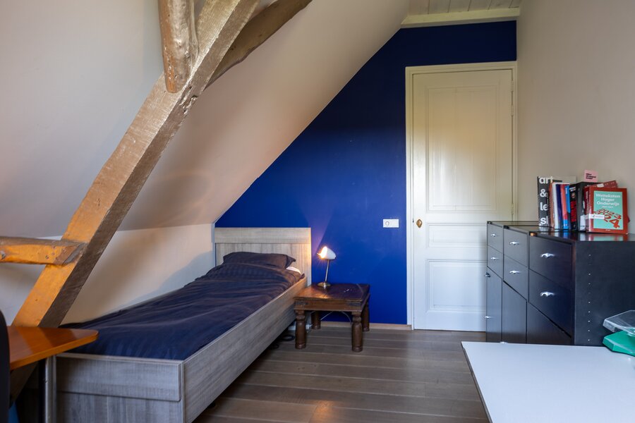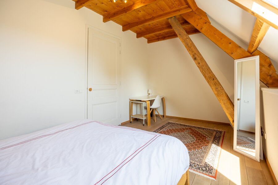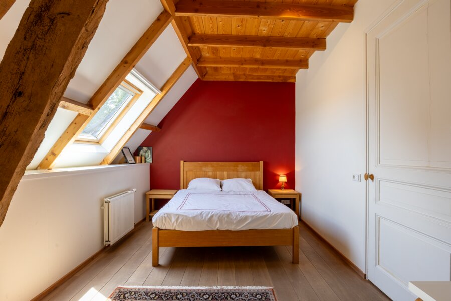 Op de overloop valt direct het bijzondere balkon op, dat extra ruimte en licht creëert. Vanuit hier zijn twee slaapkamers en een badkamer bereikbaar. De eerste slaapkamer, gelegen aan de achterzijde van de woning, is zeer ruim en voorzien van een hoog plafond met twee dakramen. Deze kamer beschikt over een laminaatvloer. De tweede slaapkamer heeft eveneens een dakraam.