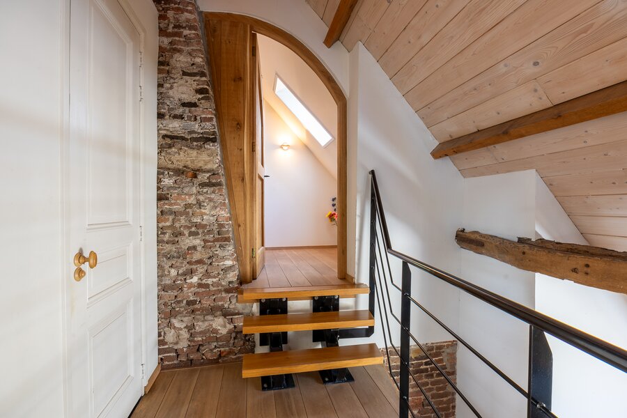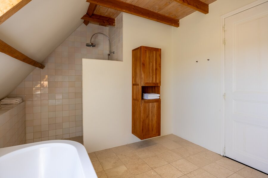 De badkamer is volledig afgewerkt met marmeren betegeling en uitgerust met een inloopdouche, ligbad, dubbele wastafel, vloerverwarming en een dakraam. Daarnaast is er op de overloop een separate toiletruimte aanwezig. De verdiepingsvloer is, met uitzondering van de badkamer en de eerste slaapkamer, voorzien van een houten parketvloer.