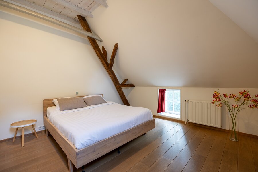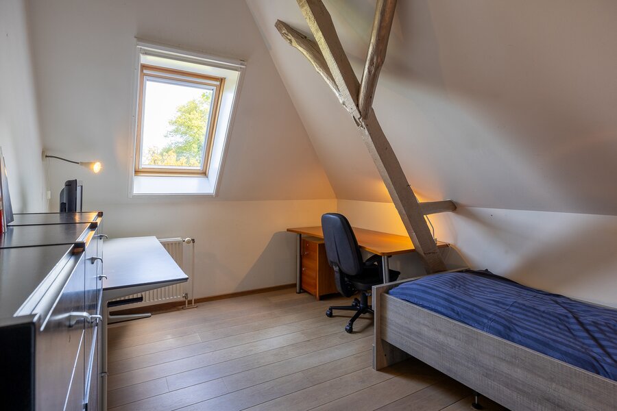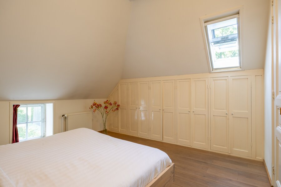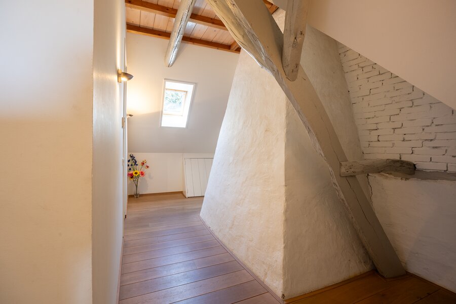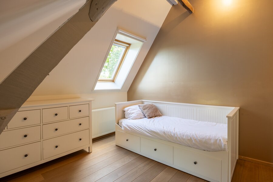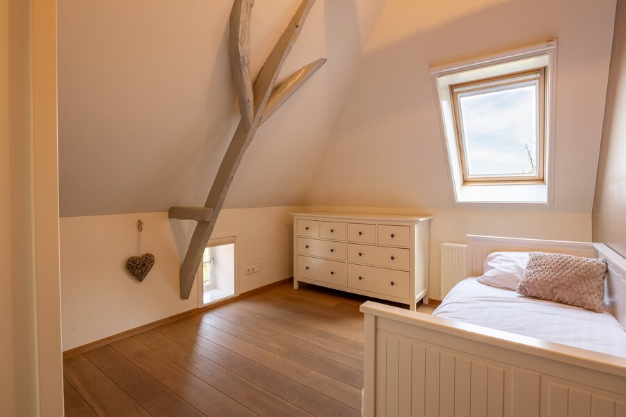 Via een klein opstapje bereikt u de slaapvleugel. Hier zorgen meerdere dakramen voor veel natuurlijk licht in de gang. Vanuit deze gang is tevens de opbergruimte toegankelijk, waar de cv-ketel is geplaatst. In de slaapvleugel bevinden zich nog drie slaapkamers: één met ingebouwde kast en draairaam, één met draairaam en dakraam en één met een dakraam.
