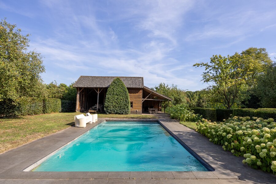 Aan de achterzijde van het hoofdverblijf bevinden zich het zwembad, een ruim terras en het atelier/gasthuis. In dit atelier zijn de technische installaties voor het zwembad ondergebracht en daarnaast beschikt het over een toilet, badkamer en een praktische overkapping. De tuin rondom is fraai aangelegd met volwassen beplanting en voorzien van looppaden die leiden naar het terras, het zwembad en het atelier.