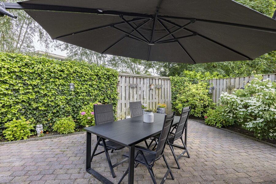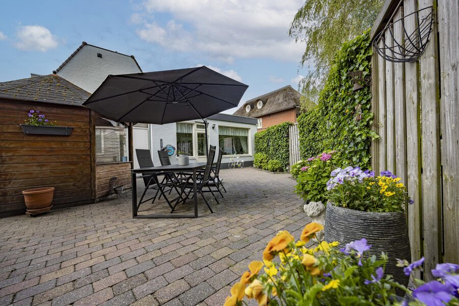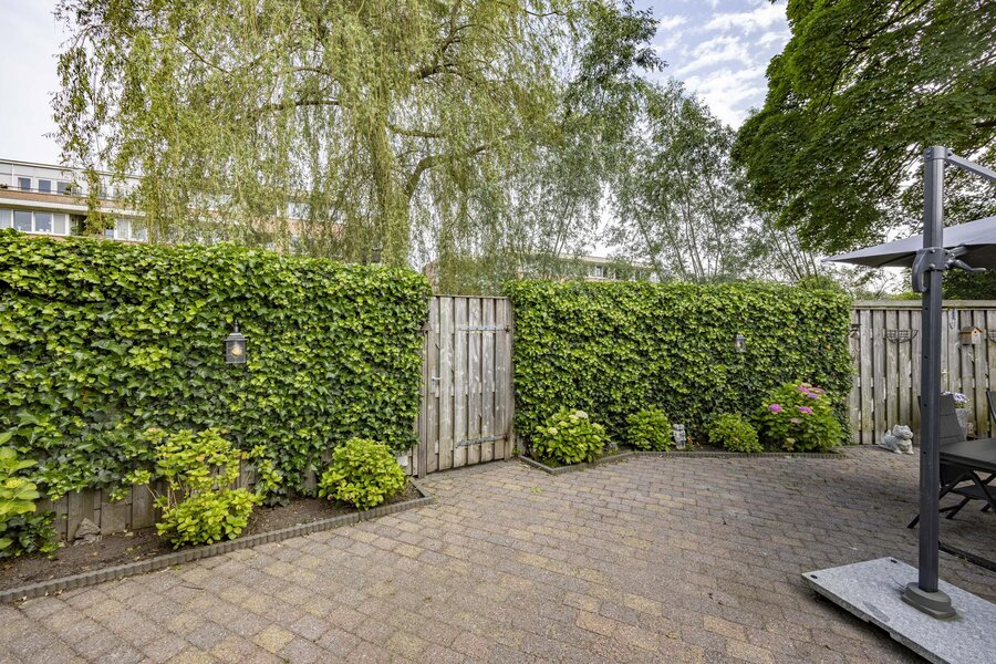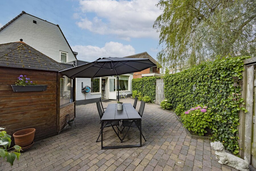 Privacybiedende bestrate achtertuin met achterom middels poort en dubbele poort, borders met beplanting, een houten en stenen berging. Parkeergelegenheid op eigen terrein.