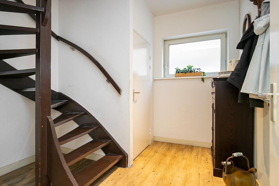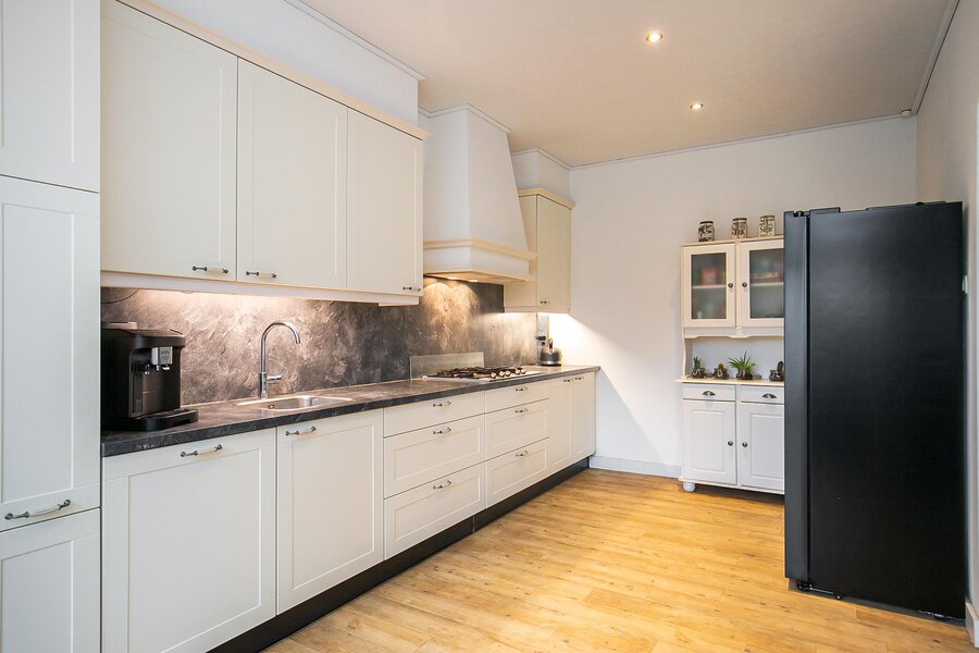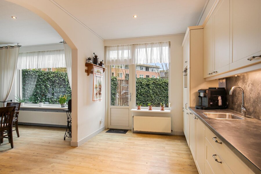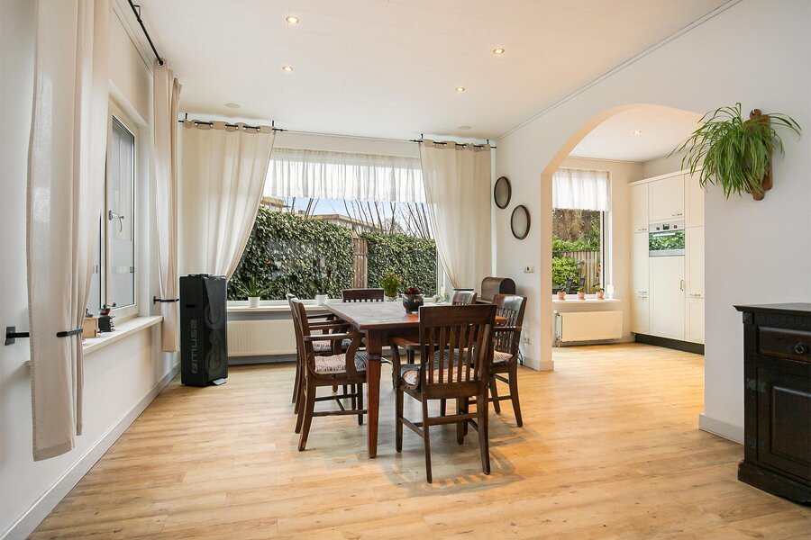 Uitnodigende entree middels voormalige salon. De voormalige salon is voorzien van airco, portaaltje met aansluiting voor een pantry en deels betegelde toiletruimte voorzien van wandcloset en fonteintje. Doorloop naar de bijkeuken met parketvloer en toegang tot de hal, werkkamer en woonkamer. Werkkamer in de voormalige berging met vaste kast. Hal met trapopgang en deels betegelde toiletruimte met wandcloset en fonteintje. Vanuit de bijkeuken is de ruime lichte woonkamer voorzien van gashaard en pvc vloer bereikbaar. Toog naar open keuken met lichte keuken voorzien van 5-pits gaskookplaat, afzuigschouw, combi-magnetron, vaatwasser en koelkast.