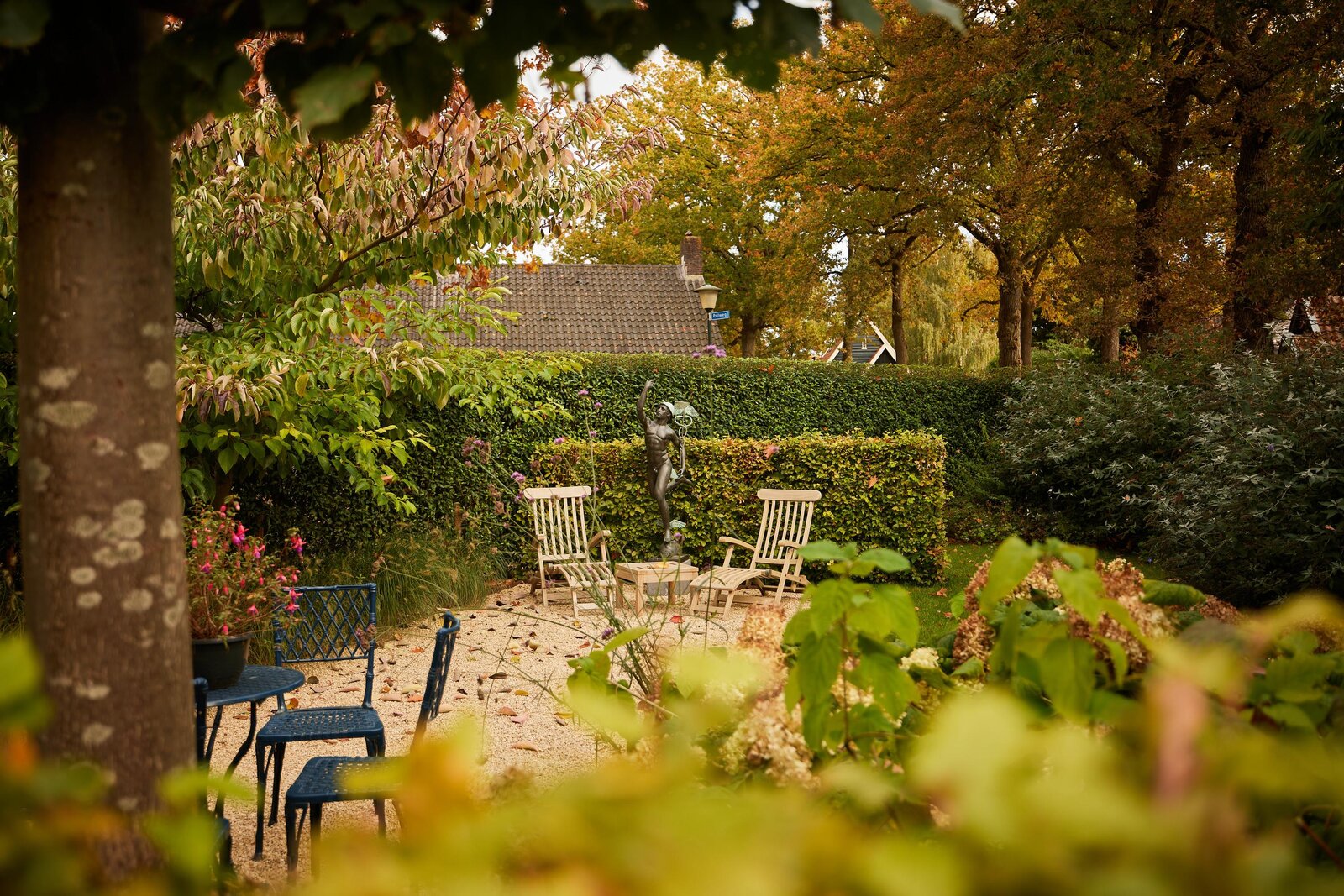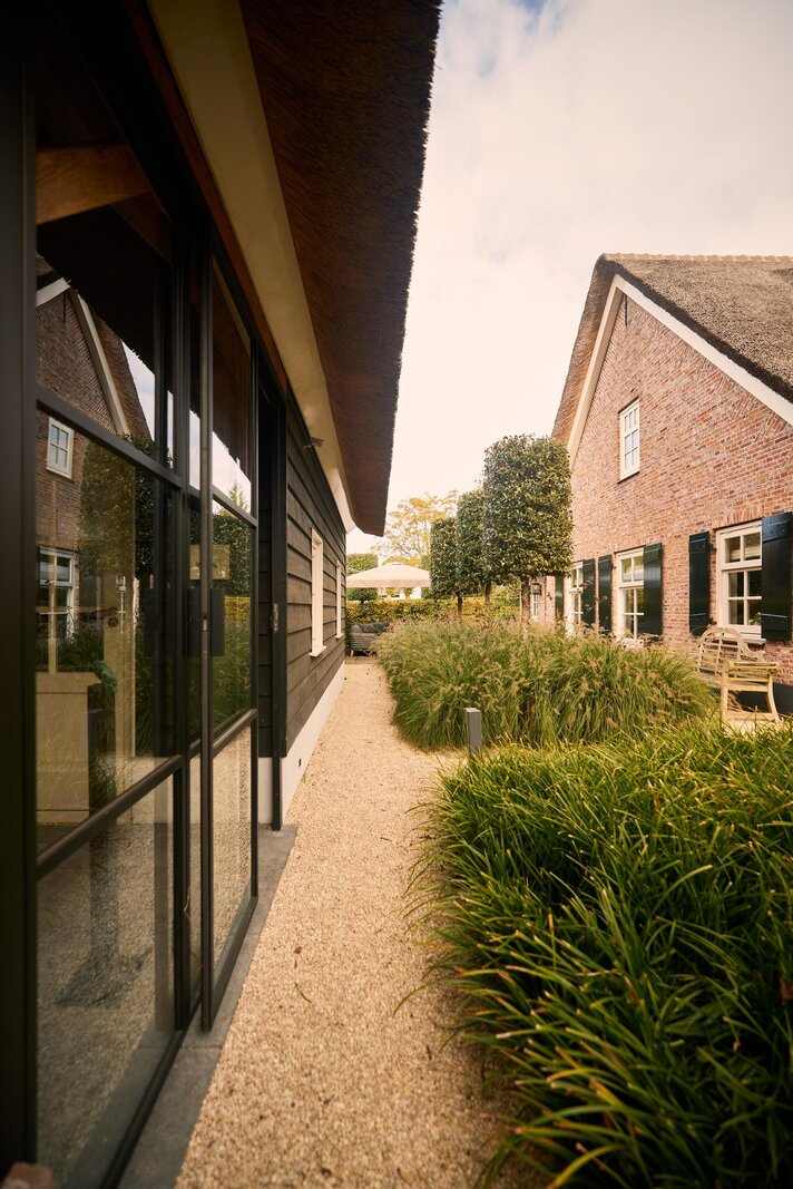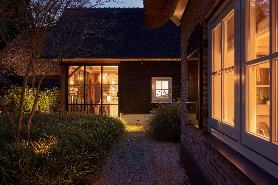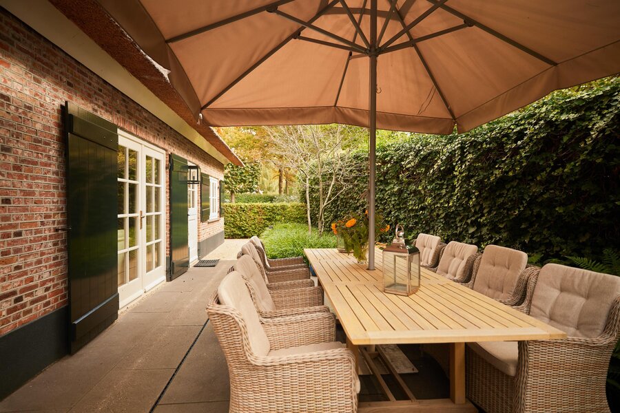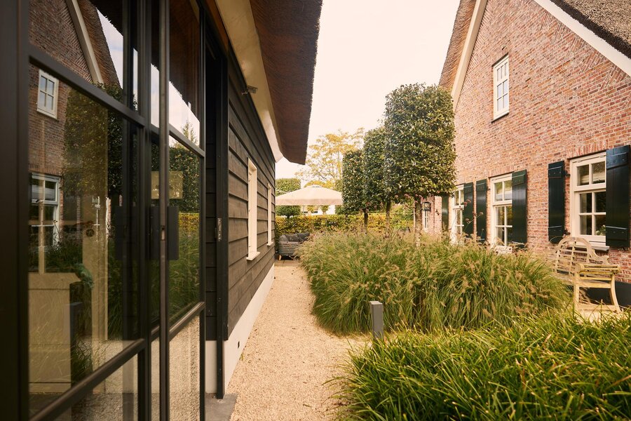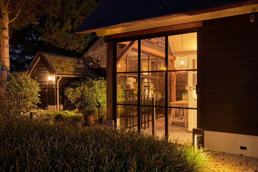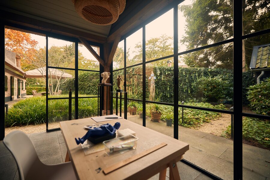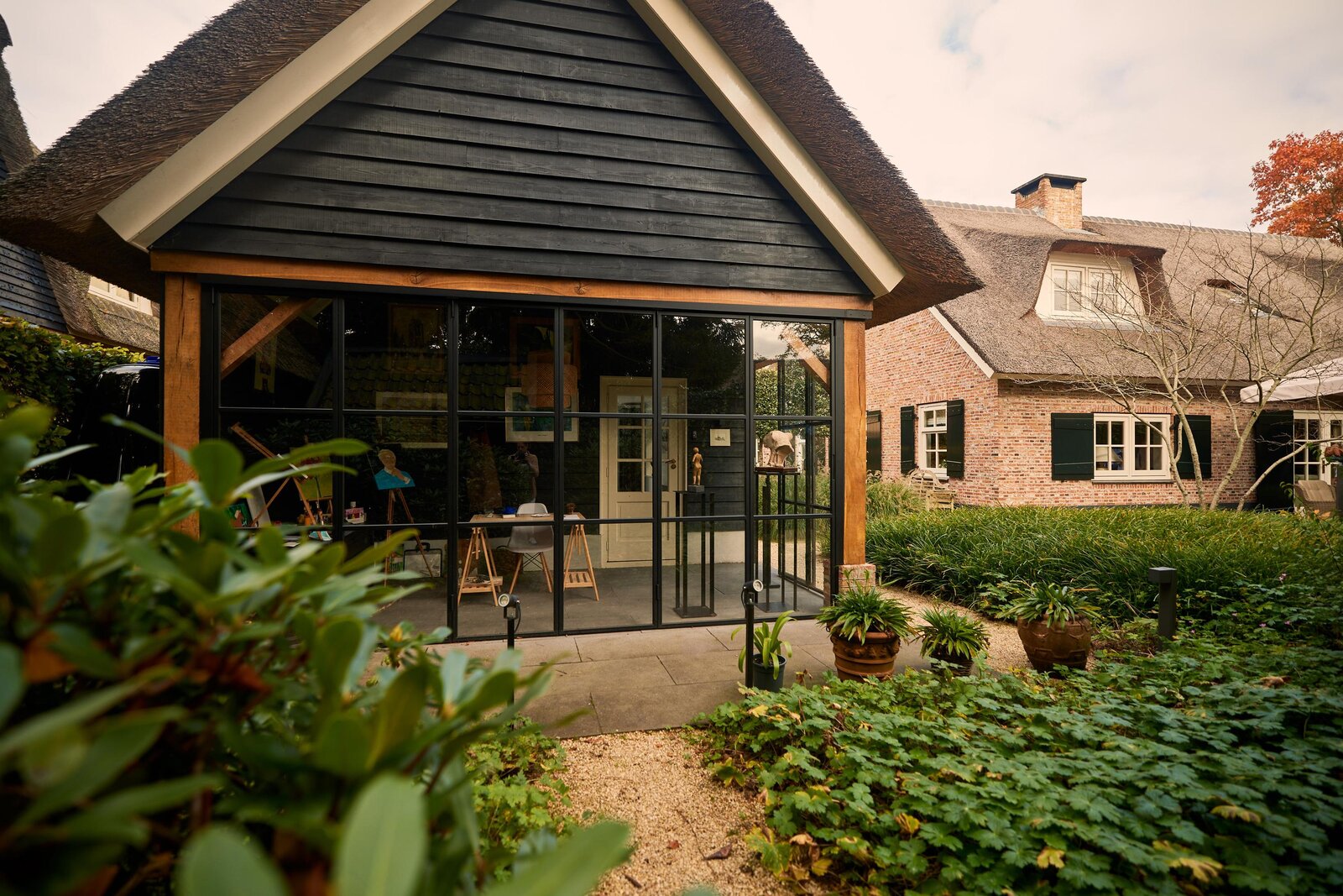 Aan de achterzijde van het bijgebouw bevindt zich een fraaie, aangebouwde overkapping die volledig is omsloten met glas. Deze lichte en beschutte ruimte wordt momenteel gebruikt als atelier en vormt een inspirerende plek om te werken, creëren of ontspannen. Dankzij de glazen wanden geniet u hier van veel daglicht en een prettige verbinding met de tuin, terwijl u tegelijkertijd beschut zit tegen weer en wind.