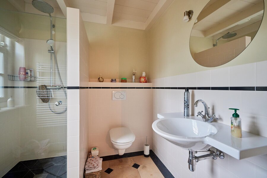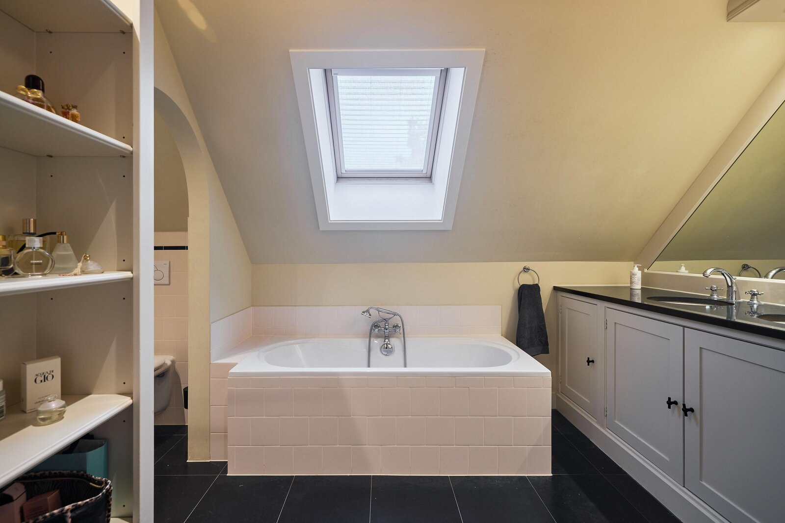 Centraal op deze verdieping ligt de badkamer, compleet ingericht met ligbad, douche, dubbele wastafel en toilet. De centrale ligging maakt deze badkamer voor alle slaapkamers gemakkelijk bereikbaar.