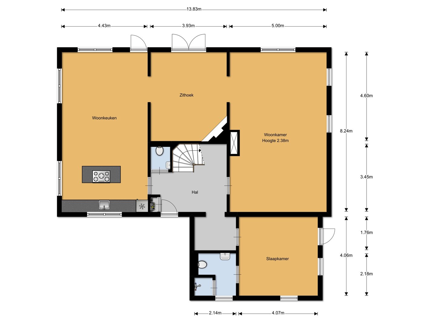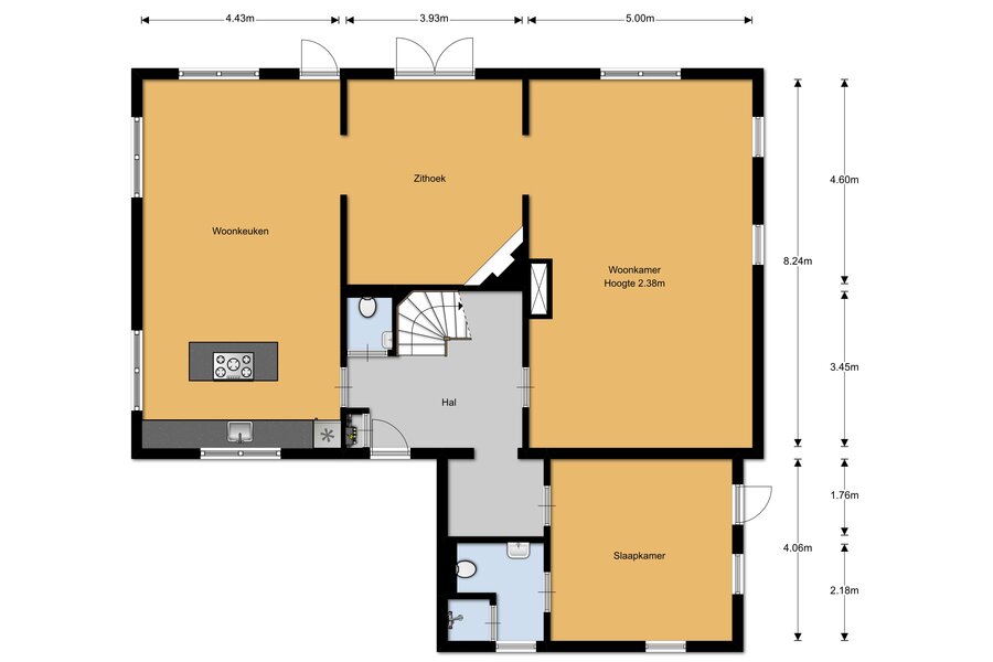 De entree leidt naar een ruime hal met toilet en trapopgang. Vanuit hier ontvouwt zich een prettige en overzichtelijke woonverdieping, waar leefruimtes logisch op elkaar aansluiten.