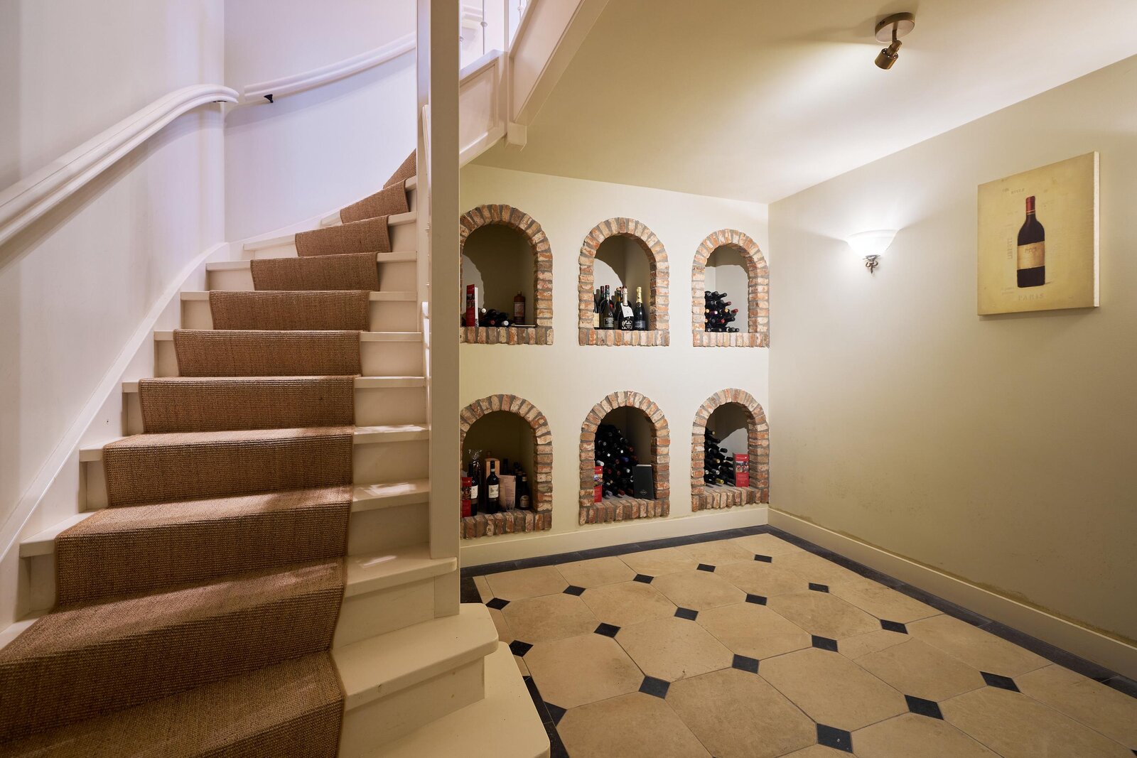 Het souterrain vormt een verrassend ruime en functionele extra woonlaag. Via de interne trap bereikt u de hal met wijnkelder, die toegang biedt tot de verschillende vertrekken.
