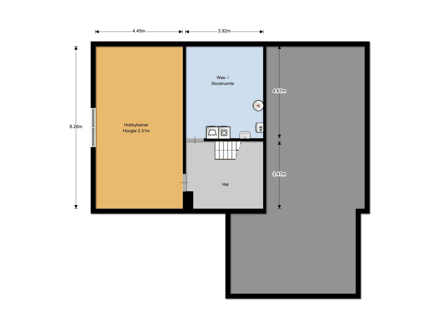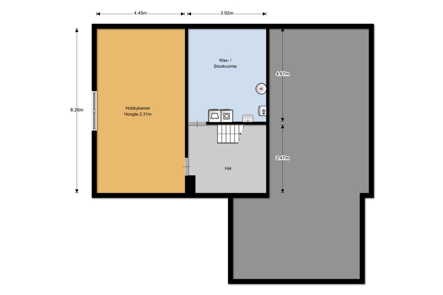 Aan de voorzijde bevindt zich een royale hobbykamer, met een prettige plafondhoogte en daglichttoetreding, waardoor deze ruimte uitstekend geschikt is als werk-, sport- of speelkamer, maar ook als extra slaapkamer, thans in gebruik als Man Cave.