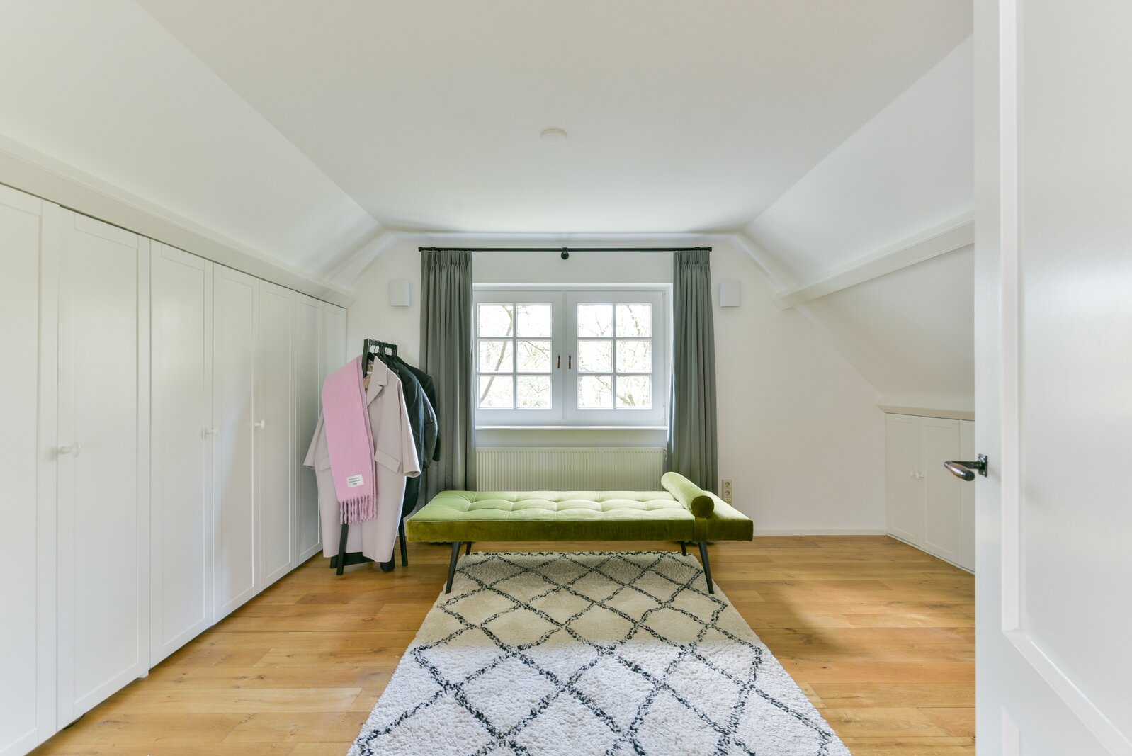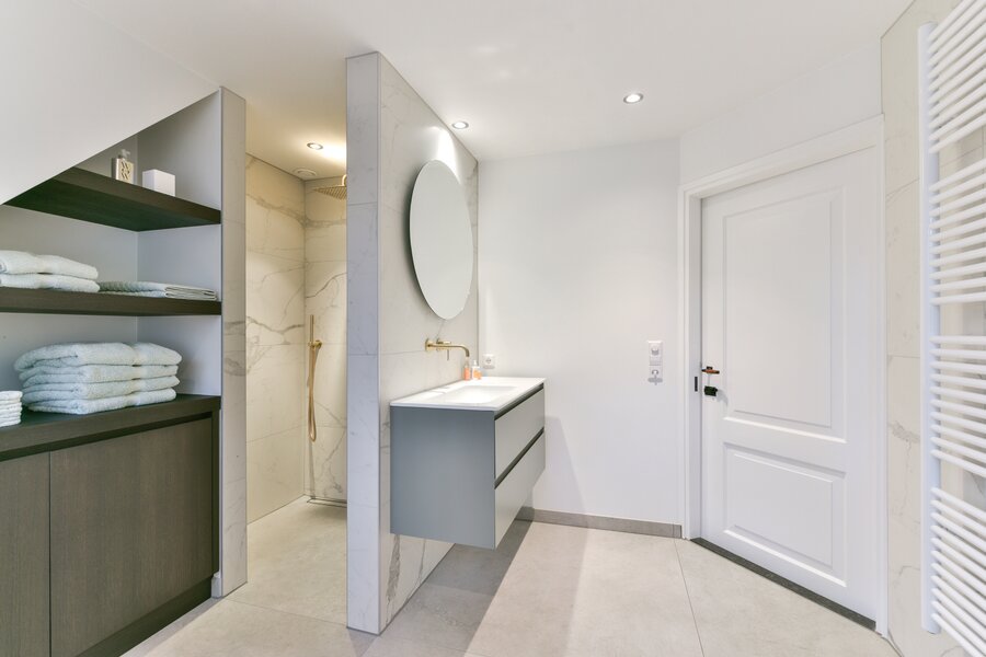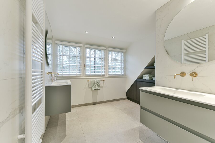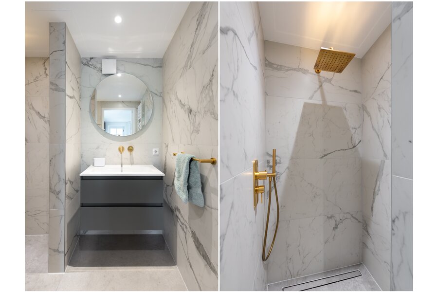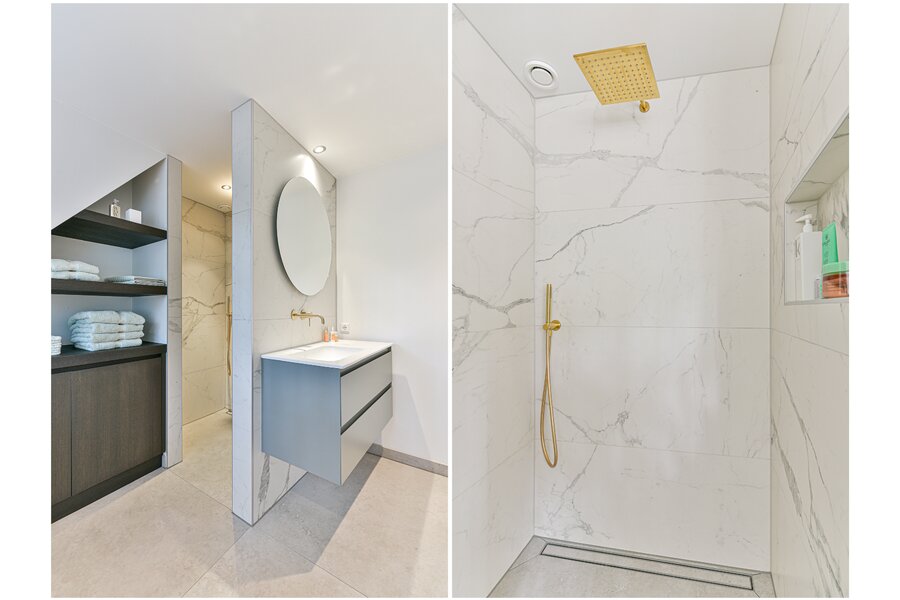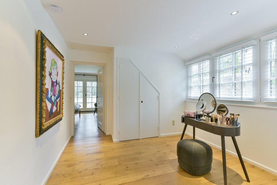 On the first floor there are two bedrooms of equal size, each with built-in wardrobes, their own character and abundant natural light. The rear bedroom has access to a balcony overlooking the surrounding greenery. The spacious landing offers the possibility, if desired, to create a third bedroom. The bathroom is finished in a luxurious and timeless style and features underfloor heating, a double washbasin, a separate walk-in shower and bespoke cabinetry, offering comfort and relaxation at a high level.