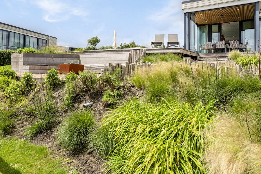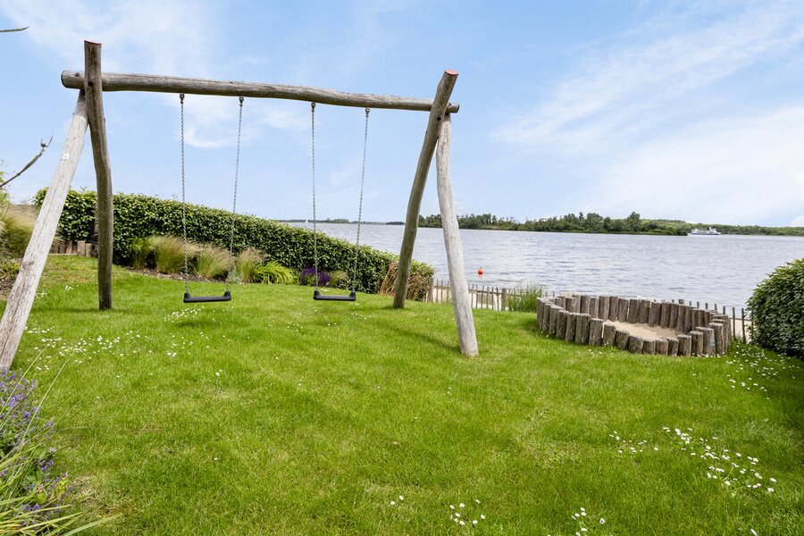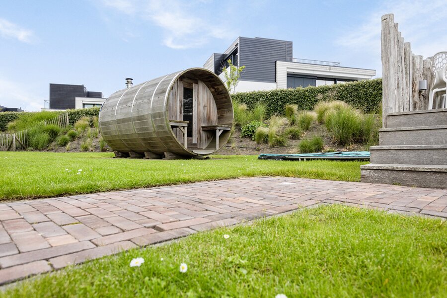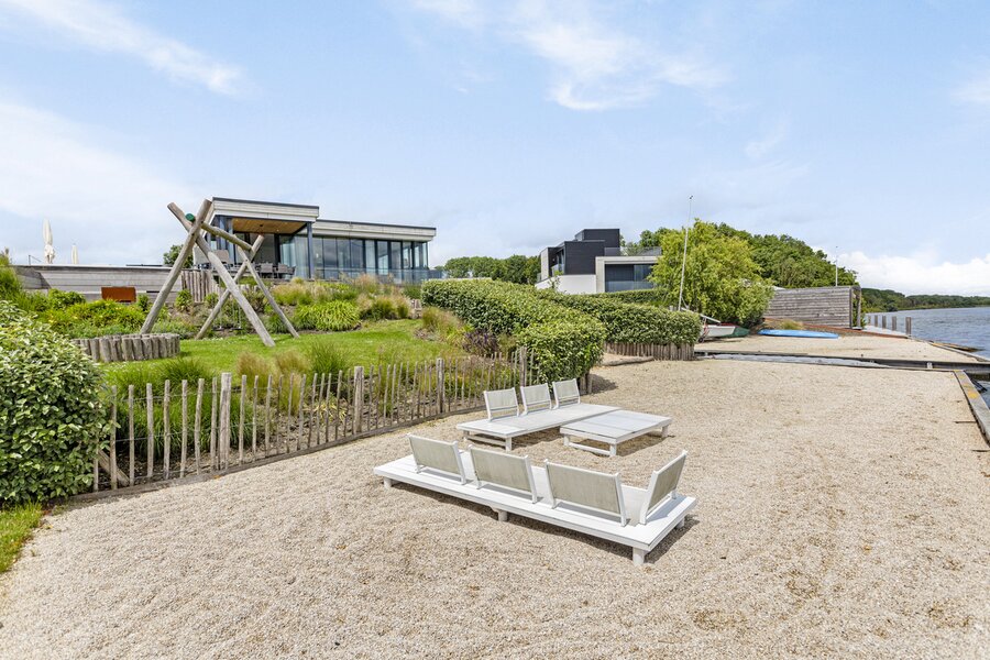 Via de trap en het pad loopt u verder de tuin in. Aan de ene kant is een loungebank met haardvuur en een speelplaats voor de kinderen gerealiseerd. Aan de andere kant is een vrijstaande sauna te vinden en een terras met een buitenkeuken. Grenzend aan het meer is een privéstrand gesitueerd. Aan de voorzijde van de woning, onder het terras, is een carport gerealiseerd. De woning beschikt over meerdere terrassen.