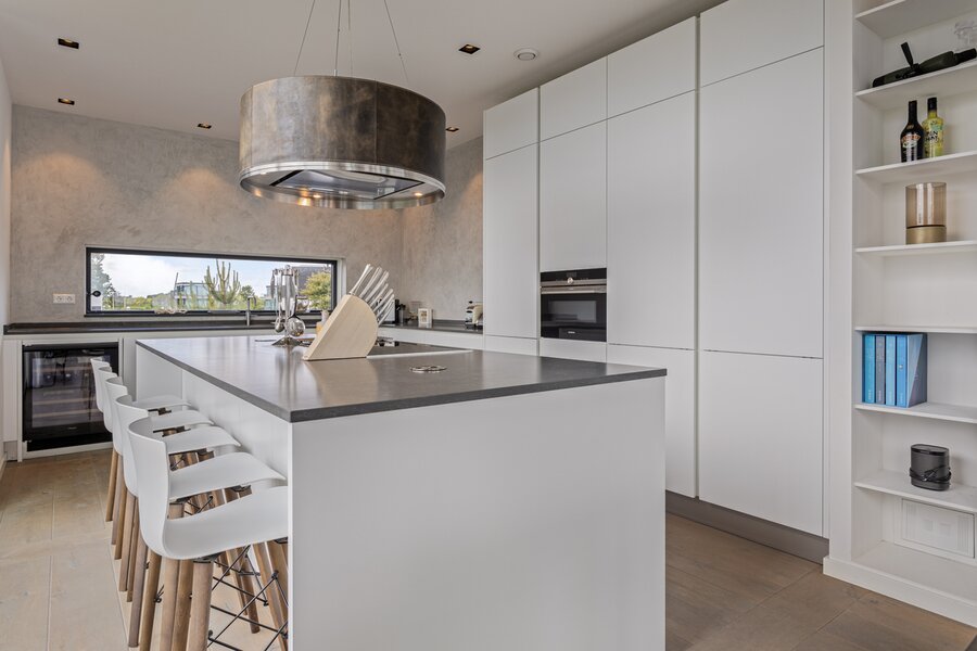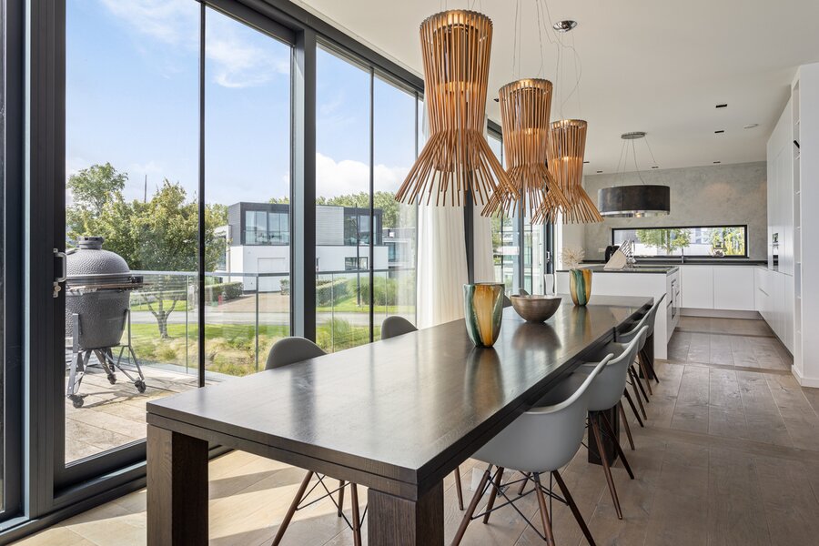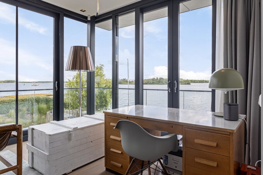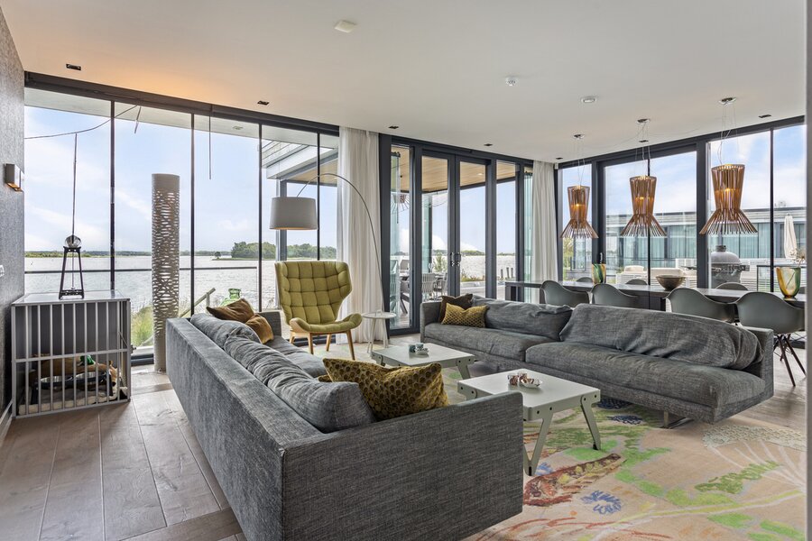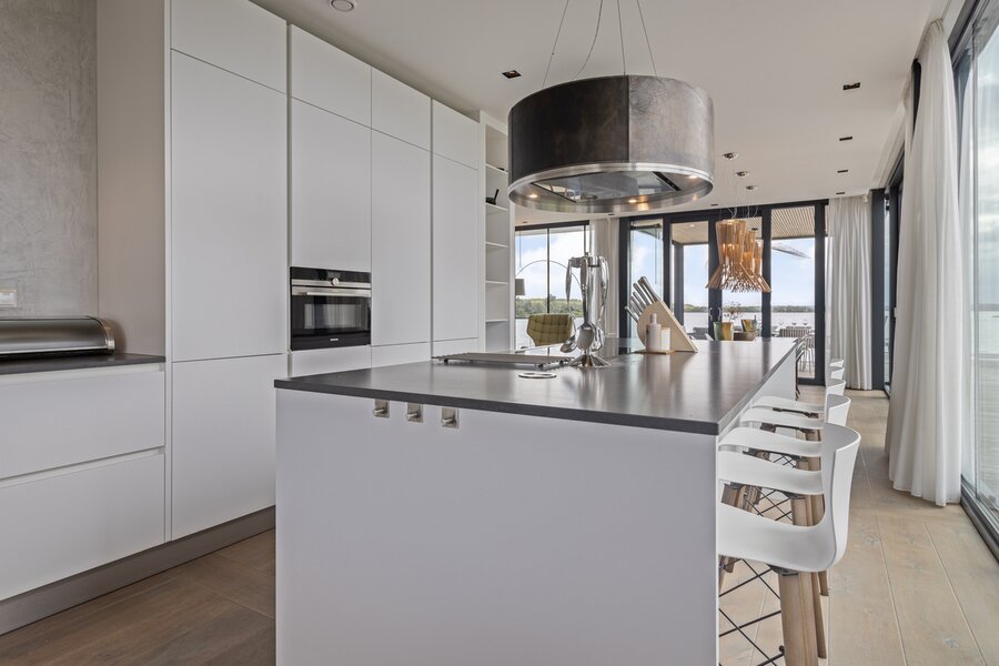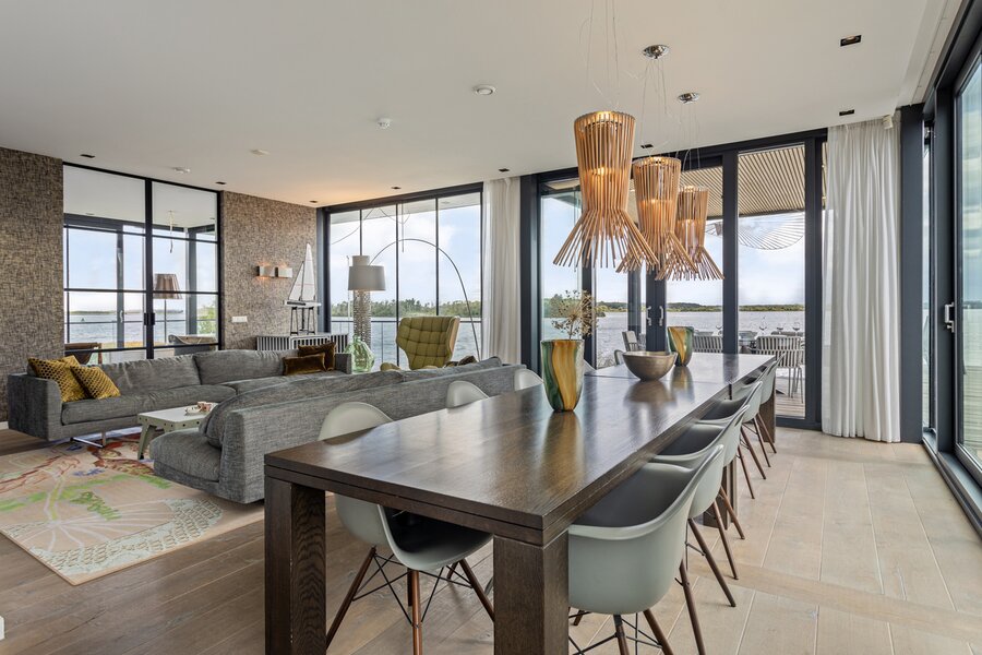 De woonkamer loopt over in de eetkamer en de woonkeuken, welke van alle gemakken voorzien is. Vanuit de eetkamer loopt u via de schuifpui het terras op. Hier is een tuinkamer gerealiseerd, welke volledig af te sluiten is met glazen wanden. Een ideale ruimte om te dineren en tevens te genieten van het fenomenale uitzicht over het water. Aansluitend is een terras met een whirlpool en de ideale buitenruimte om te kunnen ontspannen.
