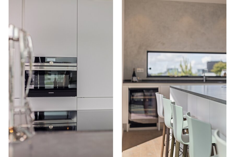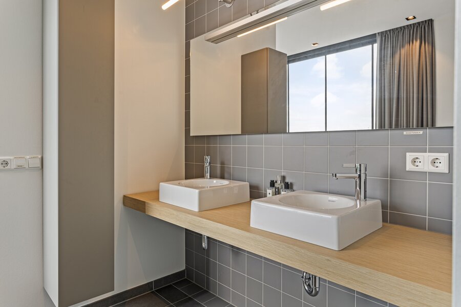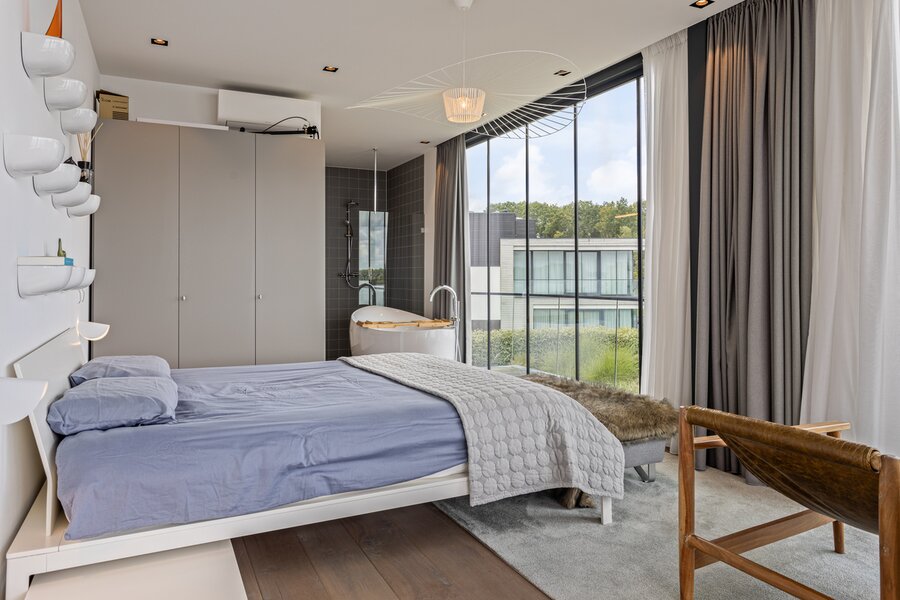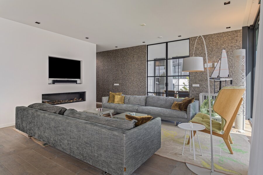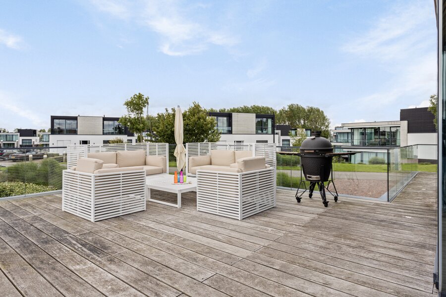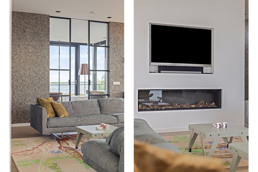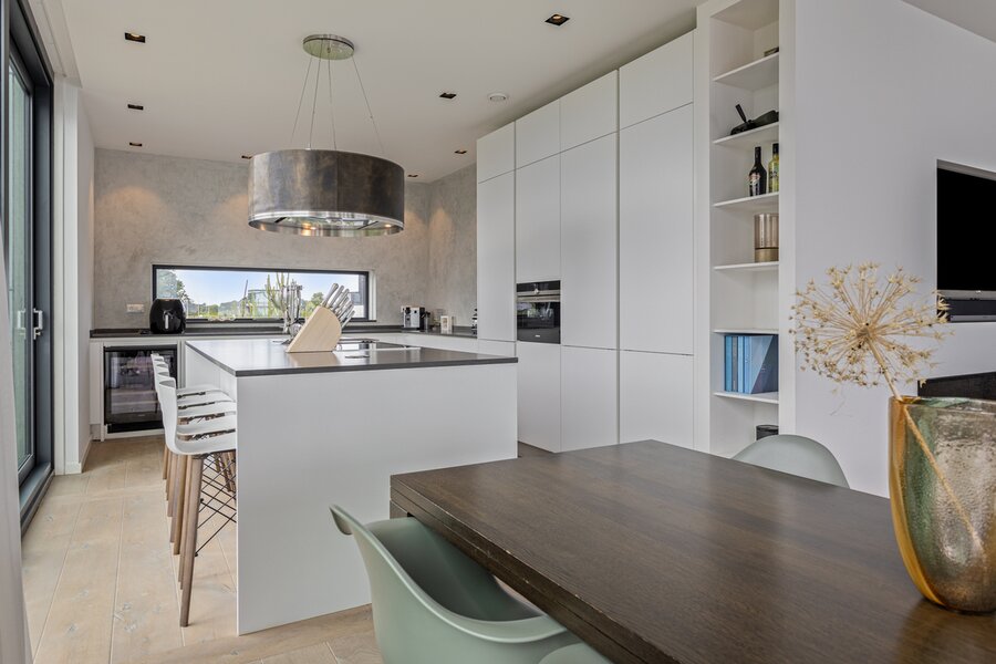 De woonkamer loopt over in de eetkamer en de woonkeuken, welke van alle gemakken voorzien is. Vanuit de eetkamer loopt u via de schuifpui het terras op. Hier is een tuinkamer gerealiseerd, welke volledig af te sluiten is met glazen wanden. Een ideale ruimte om te dineren en tevens te genieten van het fenomenale uitzicht over het water. Aansluitend is een terras met een whirlpool en de ideale buitenruimte om te kunnen ontspannen.