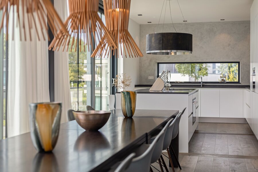 Dieses Haus verbindet modernen Komfort mit zeitloser Eleganz. Die großzügige, offene Raumaufteilung und die großen Fenster sorgen für viel natürliches Licht, während die hochwertigen Oberflächen und luxuriösen Materialien ein Gefühl von Raffinesse und Komfort vermitteln. Das Wohnzimmer, das sowohl zum Entspannen als auch zum Unterhalten einlädt, geht in ein stilvolles Esszimmer und eine voll ausgestattete, moderne Küche über.