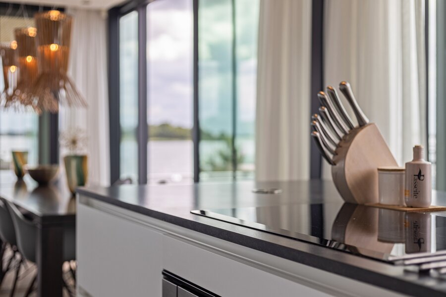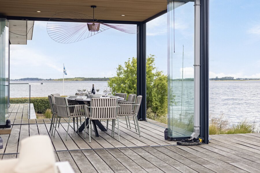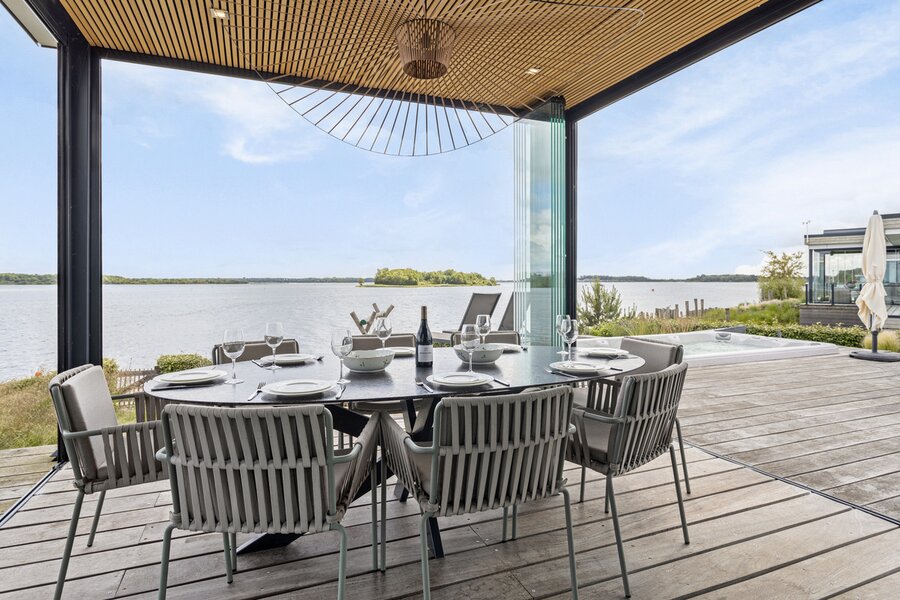 Das Wohnzimmer geht in das Esszimmer und die voll ausgestattete Essküche über. Vom Esszimmer aus führen Schiebetüren auf die Terrasse. Hier wurde ein Gartenzimmer geschaffen, das mit Glaswänden komplett abgeschlossen werden kann. Ein idealer Ort, um zu speisen und die phänomenale Aussicht auf das Wasser zu genießen. Angrenzend befindet sich eine Terrasse mit einem Whirlpool und dem idealen Platz zum Entspannen im Freien.