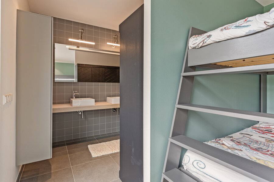Durch die Haustür gelangen Sie in den Eingangsbereich. Von hier aus können Sie die Treppe nach unten nehmen, wo Sie 4 geräumige Schlafzimmer und ein Badezimmer vorfinden. Alle Schlafzimmer haben Schiebetüren, die einen einfachen Zugang zum Garten ermöglichen. Zwei dieser Schlafzimmer haben ein eigenes Bad. Ebenfalls auf dieser Etage befindet sich ein Abstellraum mit Waschmaschinenanschluss. Auf dieser Etage befindet sich ein Carport im Außenbereich mit angrenzendem Abstellraum.
