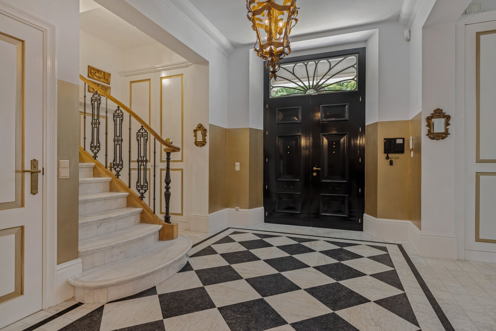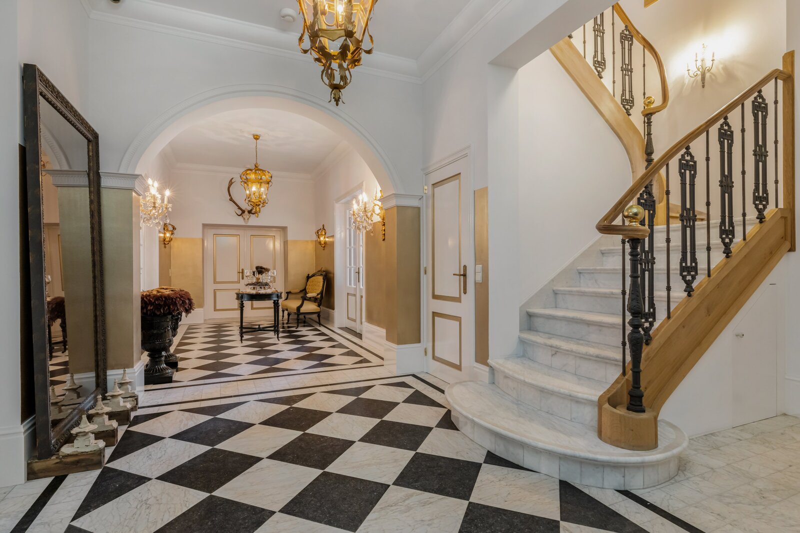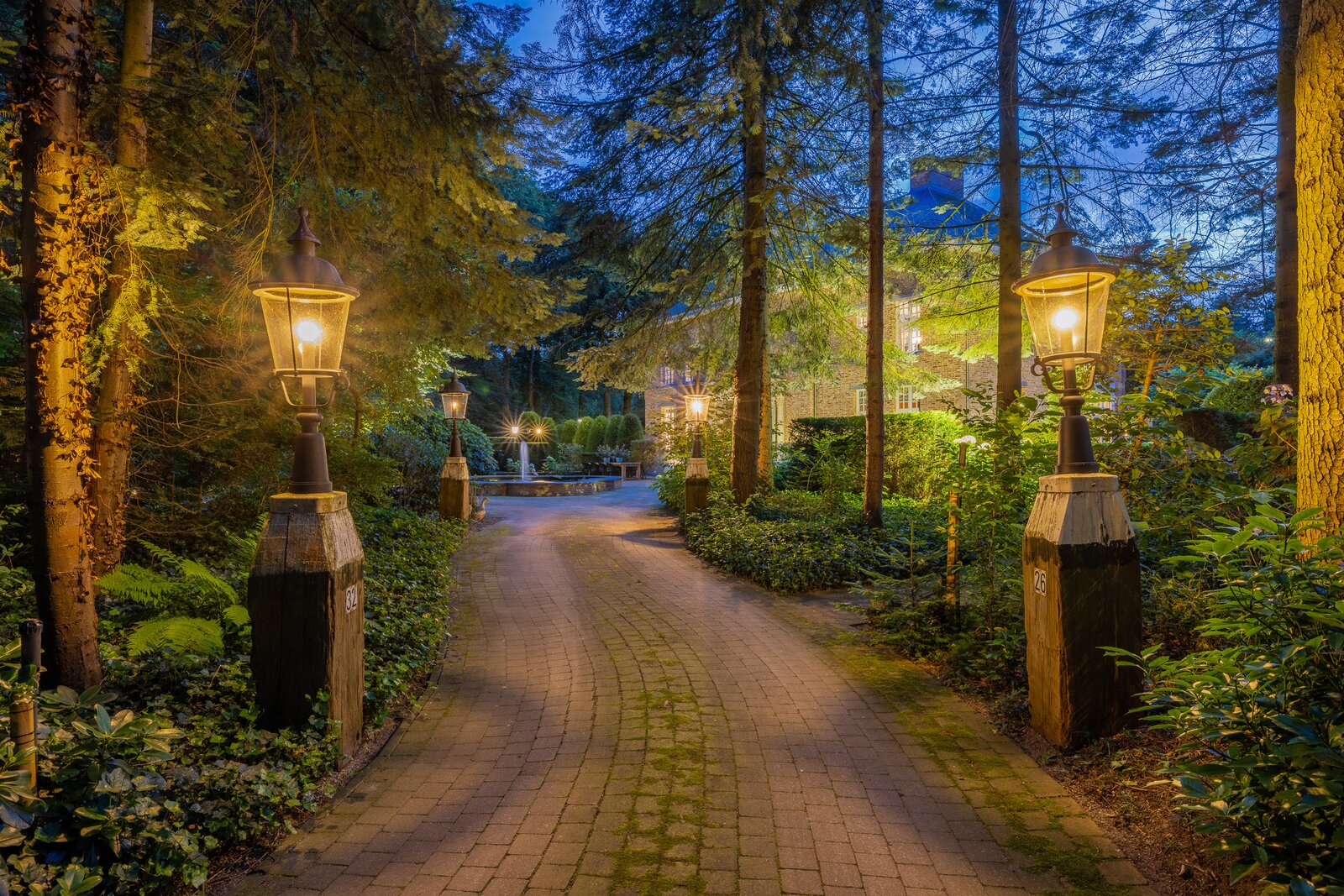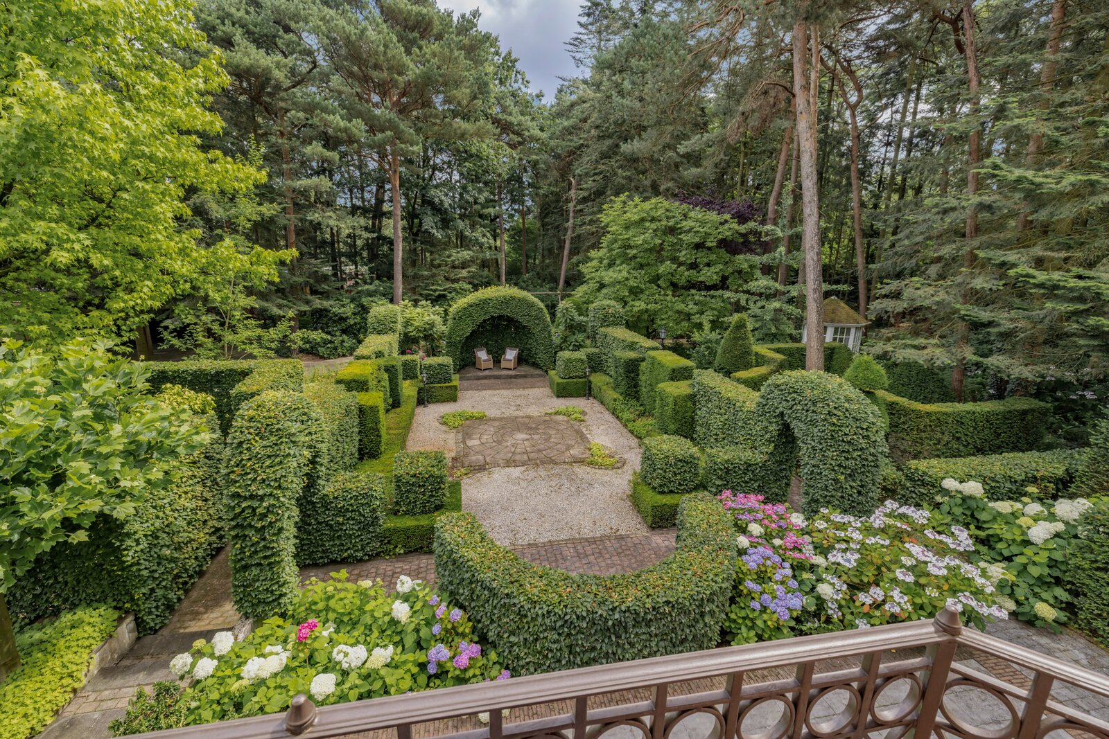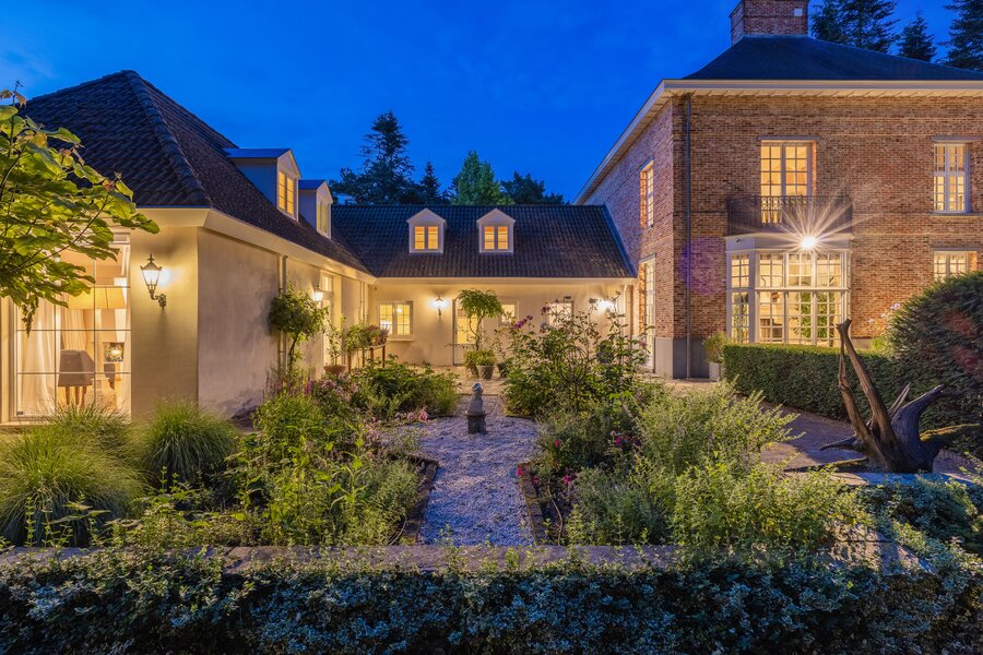 Park and woodland garden of approximately 6,000 m² with irrigation system, rich planting, and beautiful sightlines. Multiple terraces, pavilion, and illuminated driveways create an exceptional, ceremonially worthy ambiance.