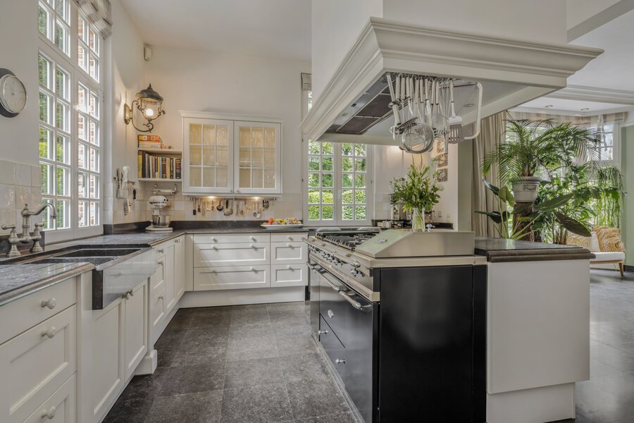 Impressive entrance hall with oak sweeping staircase and guest toilet. Front room (TV/office), bright living room with bay window and fireplace, dining room, and semi-open kitchen with Lacanche range. Pantry cellar, ideal as a wine cellar.