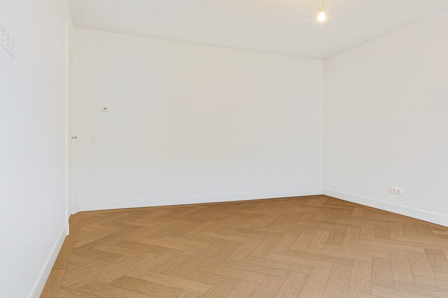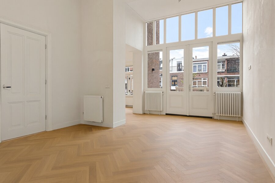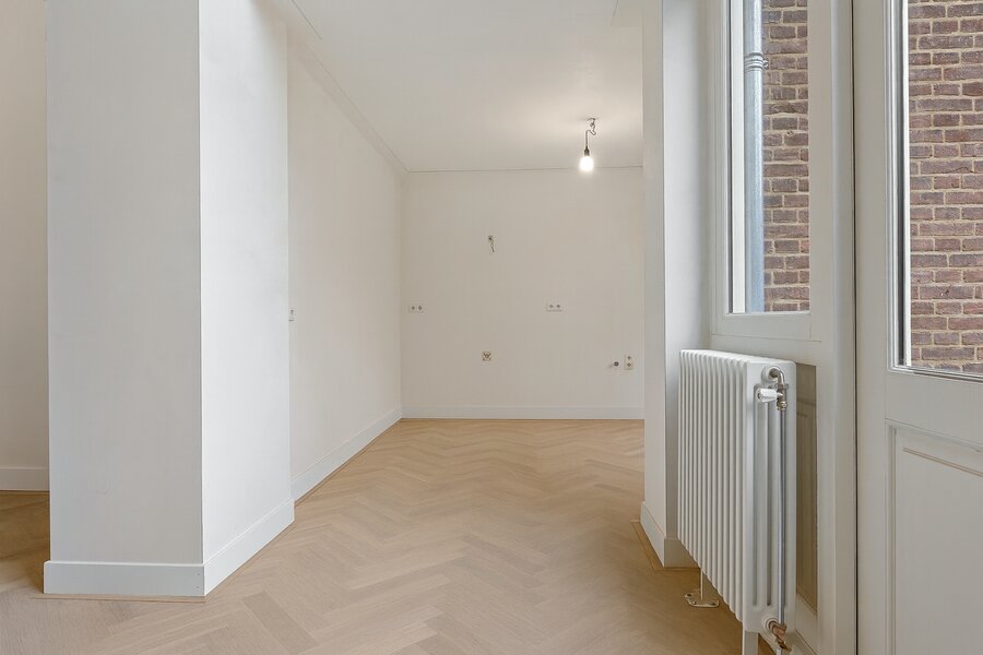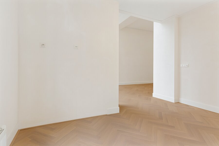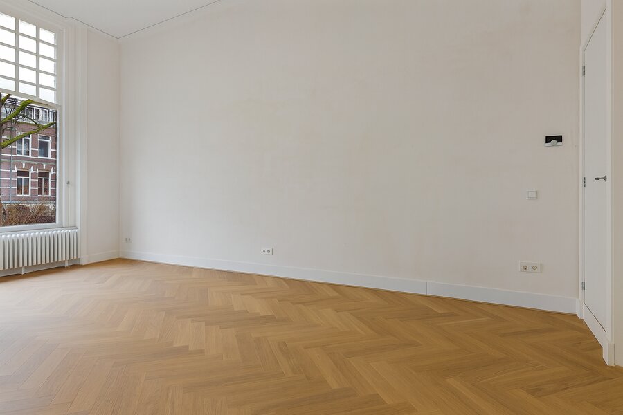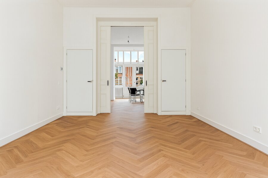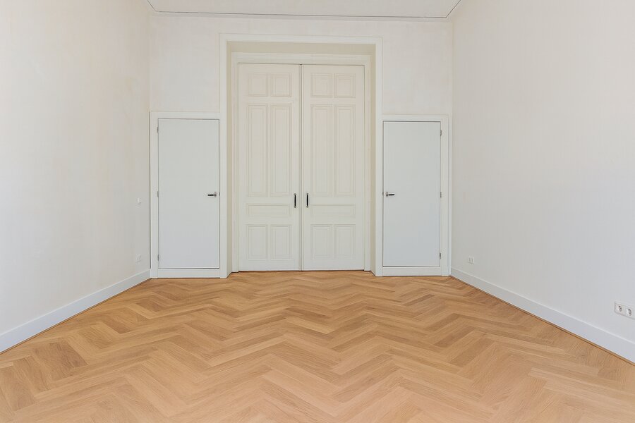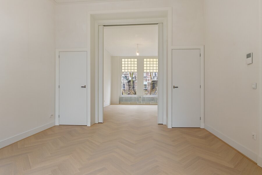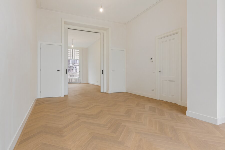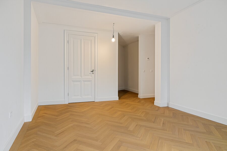 Apartment entrance, hallway with toilet, impressive and spacious dining and living room en-suite, French doors leading to the front balcony, semi-open kitchen (yet to be installed). The characteristic details have been carefully restored or preserved during the renovation. Think of ornamental ceilings, panel doors, and en-suite doors with beautiful woodwork. These details can be complemented to your personal style with flooring and optional wall colors or coverings.