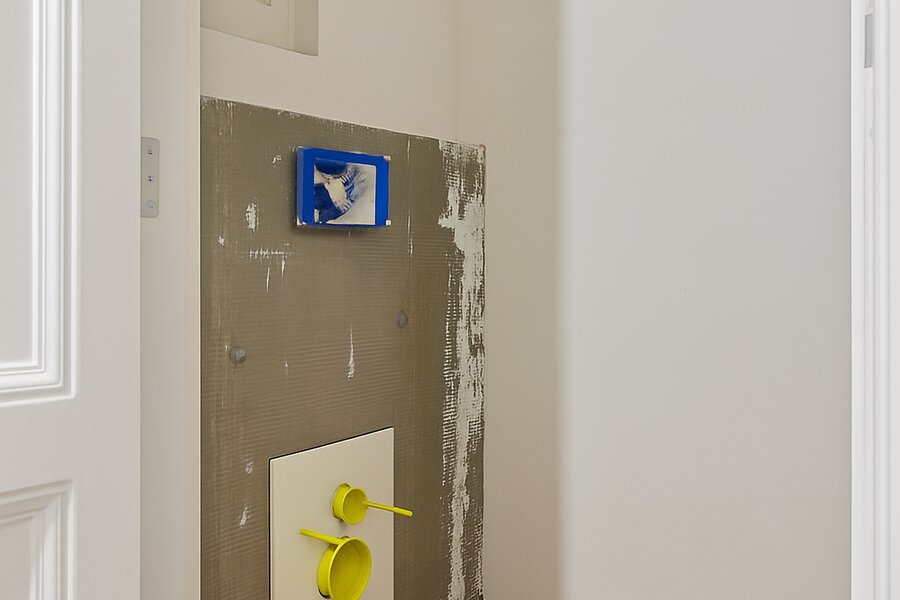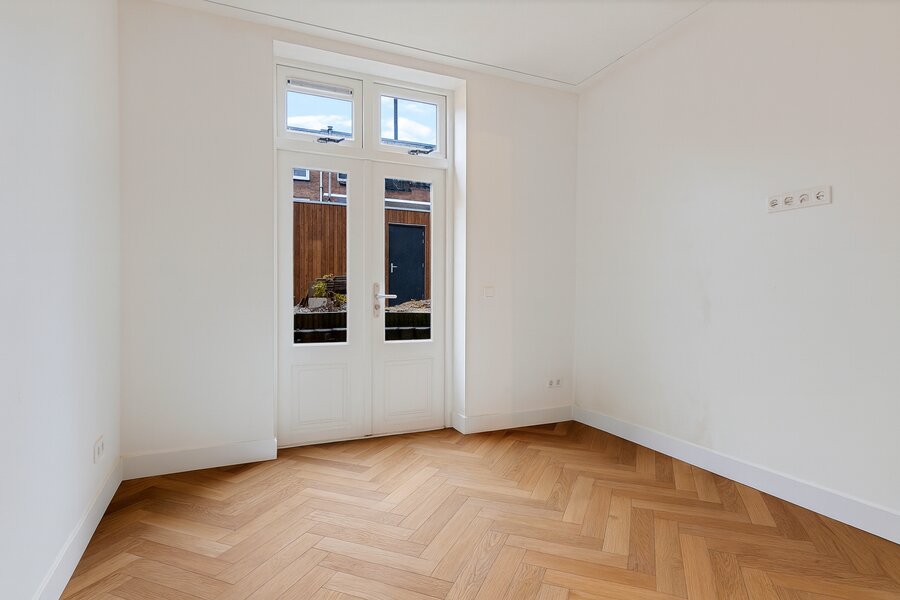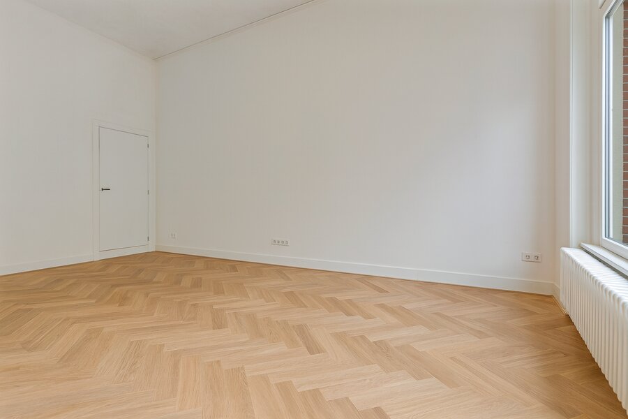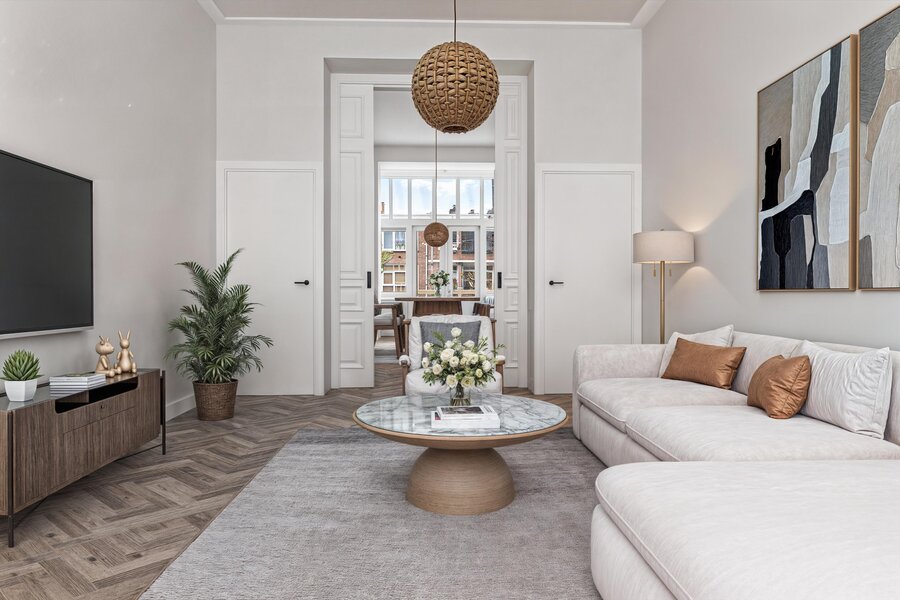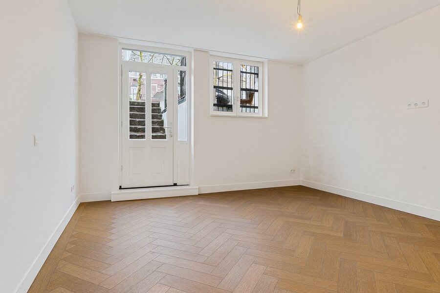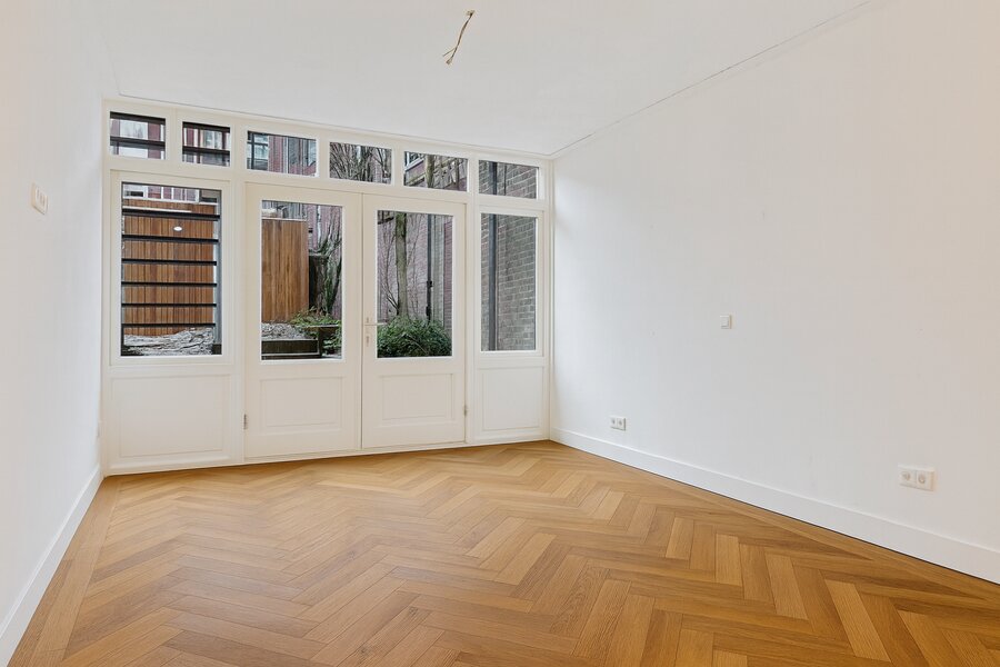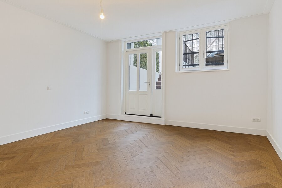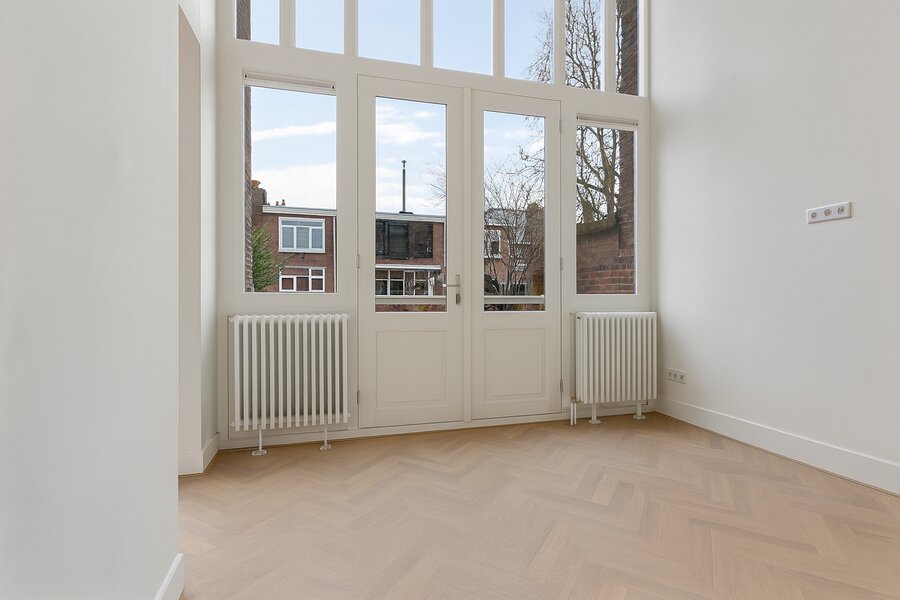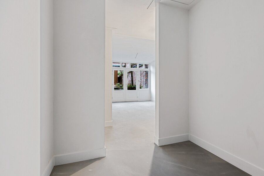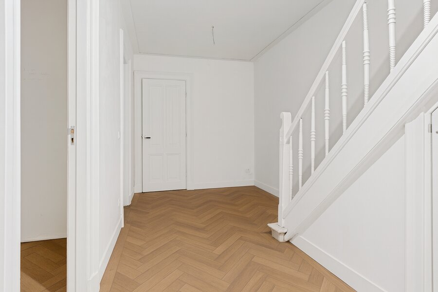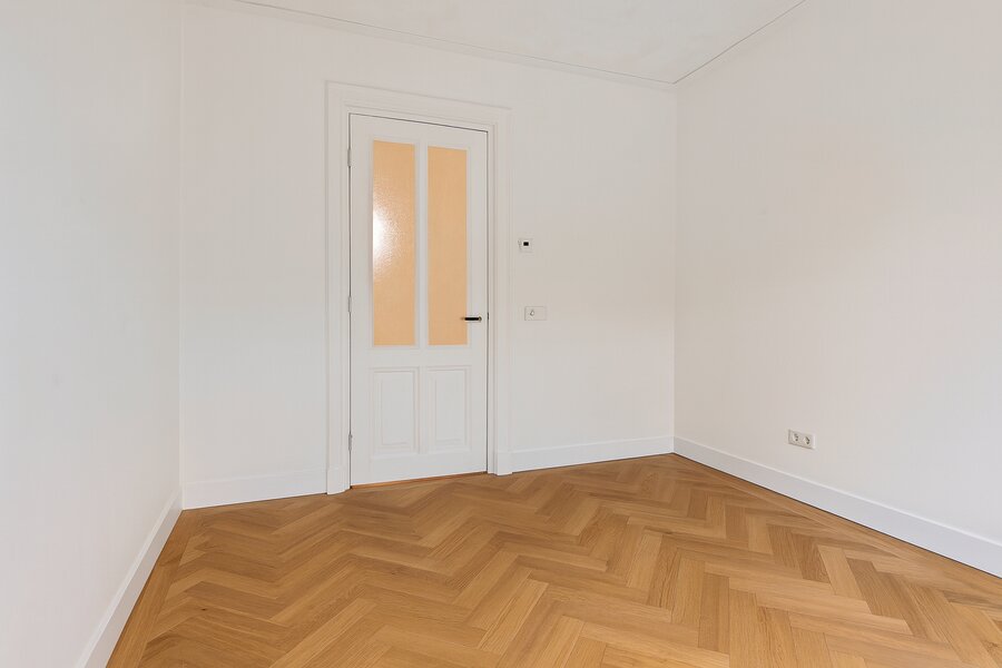 Apartment entrance, hallway with toilet, impressive and spacious dining and living room en-suite, French doors leading to the front balcony, semi-open kitchen (yet to be installed). The characteristic details have been carefully restored or preserved during the renovation. Think of ornamental ceilings, panel doors, and en-suite doors with beautiful woodwork. These details can be complemented to your personal style with flooring and optional wall colors or coverings.