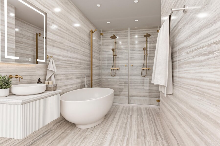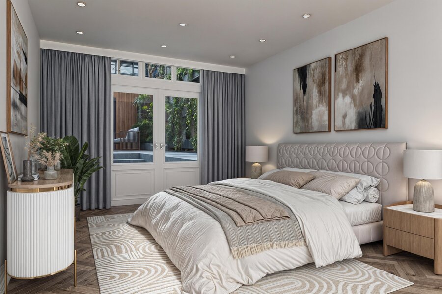 The apartment features three spacious bedrooms, each providing enough room for a comfortable and tranquil stay. The bathroom is yet to be designed, giving you the opportunity to style and furnish it according to your own preferences. The lower level boasts exceptionally high ceilings and French doors that open directly onto the garden at the same level, creating a bright and airy atmosphere.