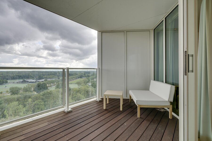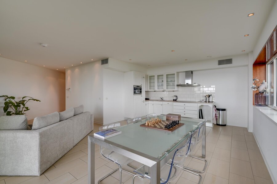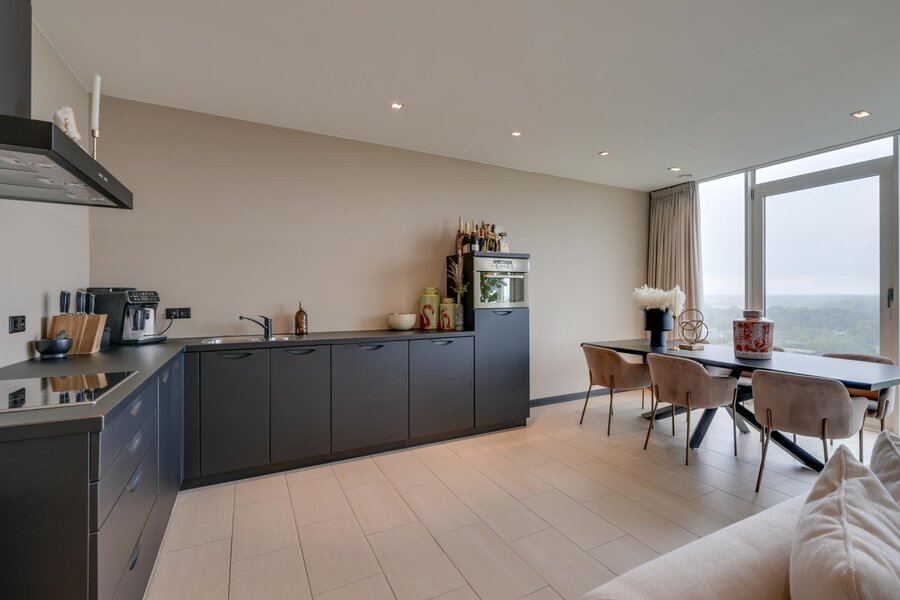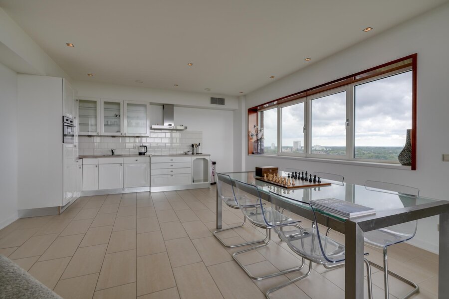 Taking the elevator to the 13th floor, we arrive at Herculeslaan 130. It consists of one apartment right, currently divided into two units. You have access to two kitchens, two bathrooms, two living rooms, and a spacious balcony. This is an ideal setup for those who want to keep parents, an au-pair, or children close by, while maintaining independent living spaces!