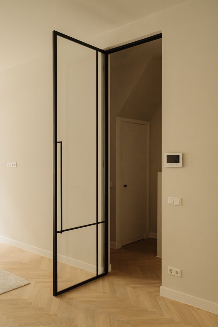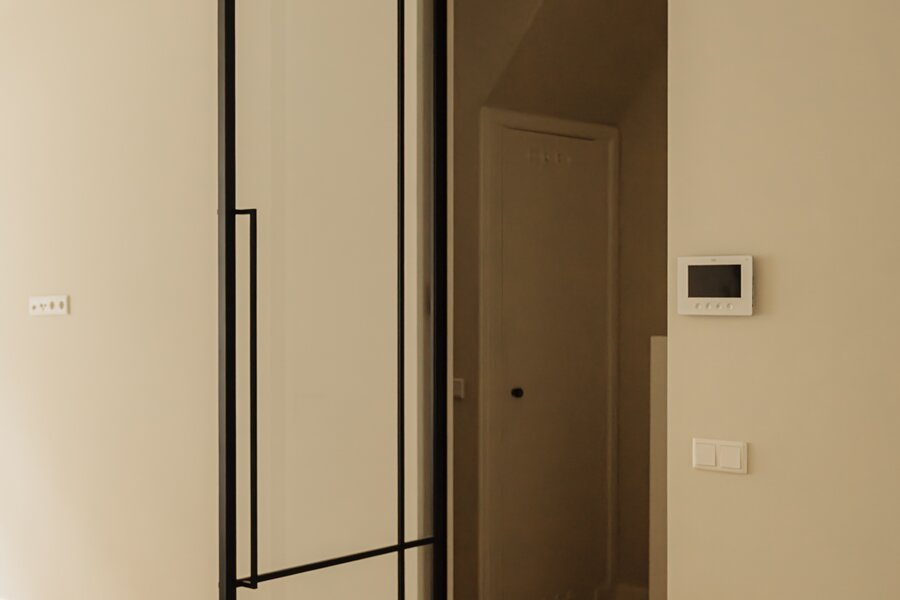 Private entrance at street level. The hallway leads to a spacious living room with an open kitchen at the front of the apartment.
