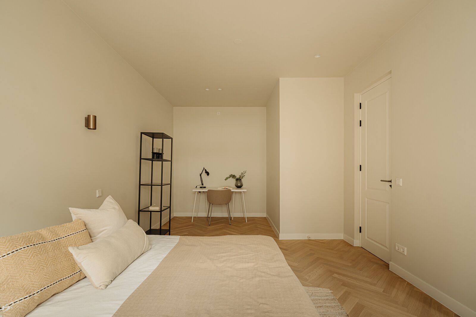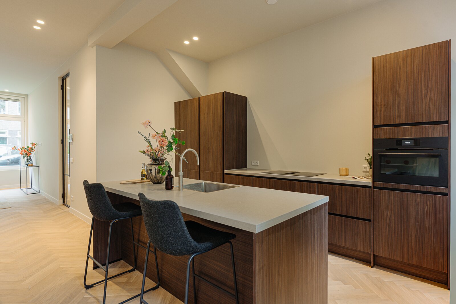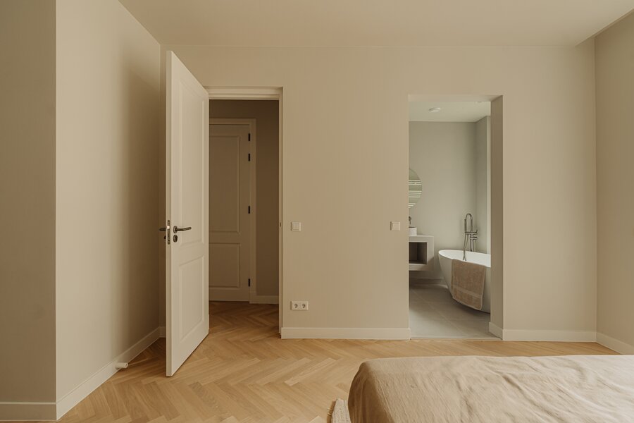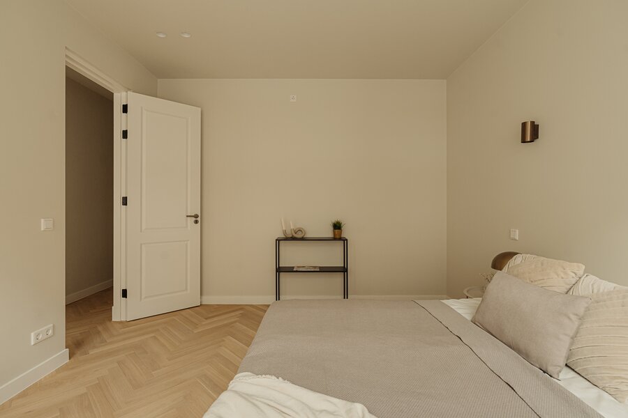 The entire apartment is fitted with a stylish herringbone wooden floor with underfloor heating throughout.