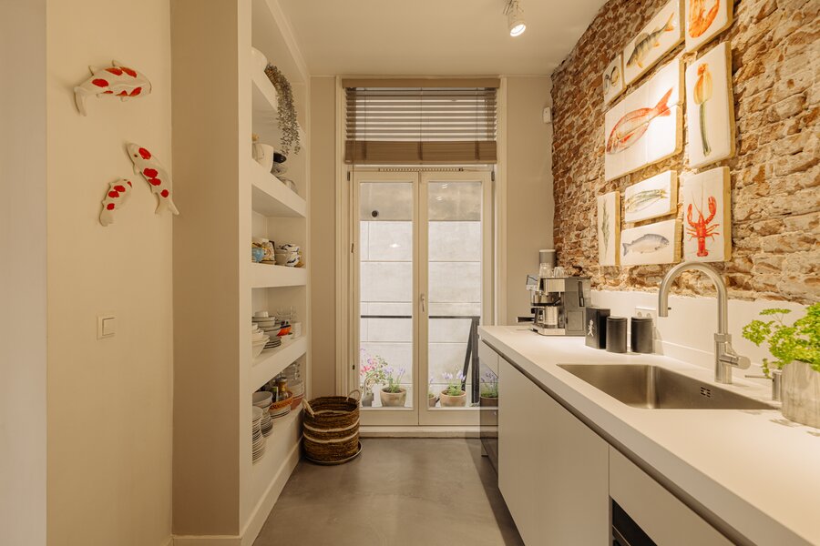 De halfopen keuken vormt een prettig geheel met het eetgedeelte en is uitgevoerd in een moderne, tijdloze stijl. De keuken is voorzien van diverse hoogwaardige inbouwapparatuur, waaronder een hete-lucht stoomoven, een luxe geïntegreerd afzuigsysteem in de kookplaat en een Quooker Cube (5-in-1 kraan). Vanuit de keuken geven openslaande deuren toegang tot het balkon en via een zwarte stalen trap tevens tot de beschutte stadstuin met een eigen achterom via de Jacob van Lennepkade: ideaal voor fietsen.