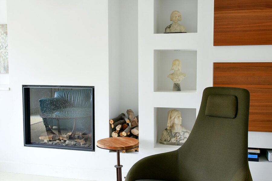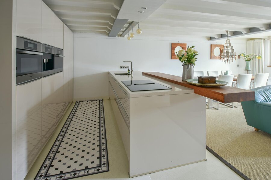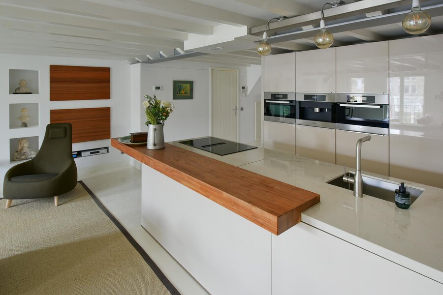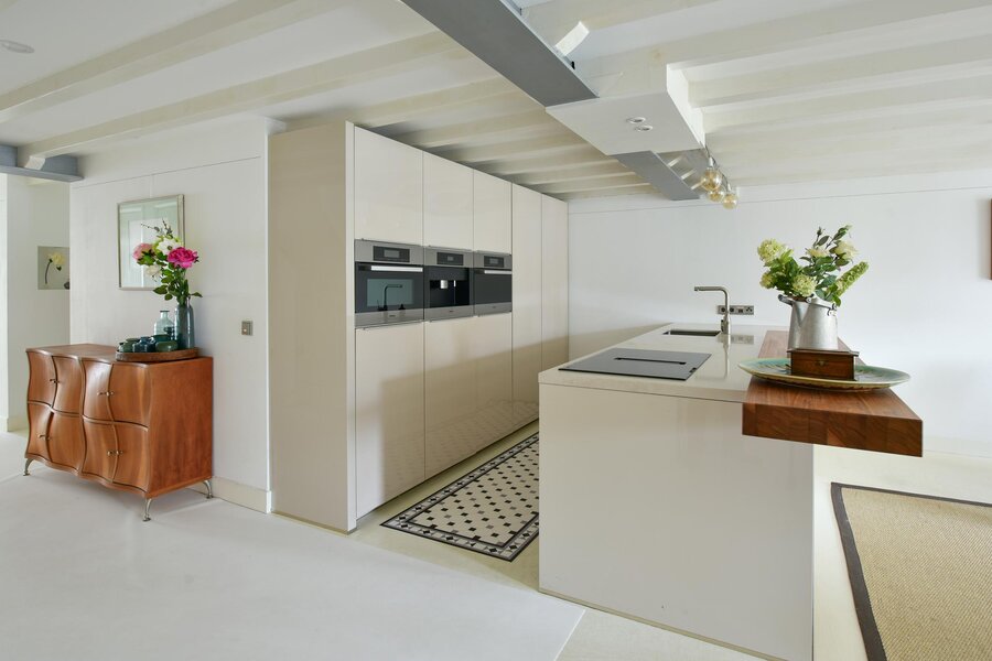 Spacious living room at the front with doors to a French balcony, a cozy gas fireplace incorporated into a built-in cabinet and the kitchen in the middle of the floor in open arrangement. The modern high gloss kitchen is equipped with various appliances including an induction hob with integrated extractor, dishwasher, refrigerator, freezer, steam oven, combination oven as well as a coffee machine (Miele). The kitchen cabinets continue into the built-in cupboard of the living room which is finished in walnut wood. This can also be found in the window sills.