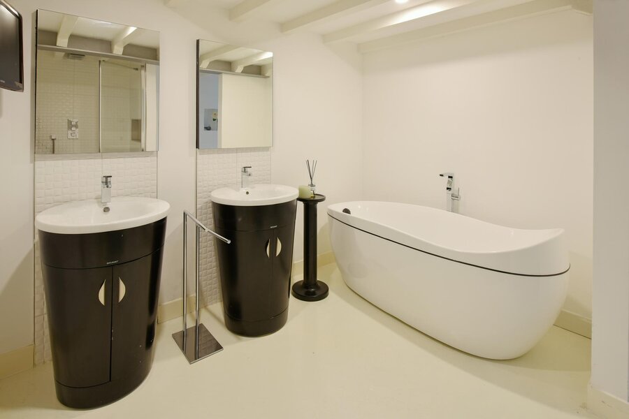 In the middle of the floor is the spacious bathroom located which has a freestanding bath, large shower, double sink with cabinet and again preparation for coax and utp.