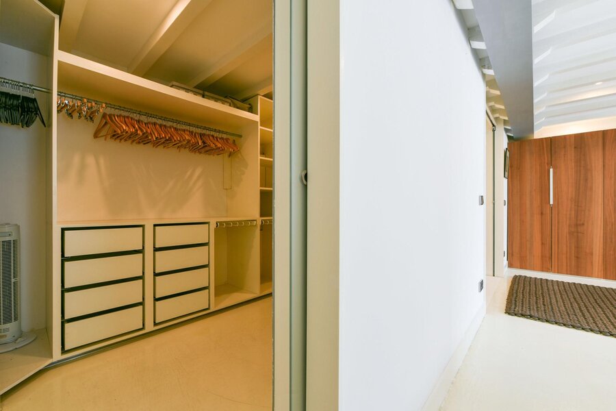 From the kitchen you walk through the central hallway to the large bedroom at the rear of the house. This bright bedroom has a closet on one side and a walk-in closet on the back. As described earlier, this room can be divided into two, with both rooms having ample closet space. From these rooms there is then also access to the possible balcony.