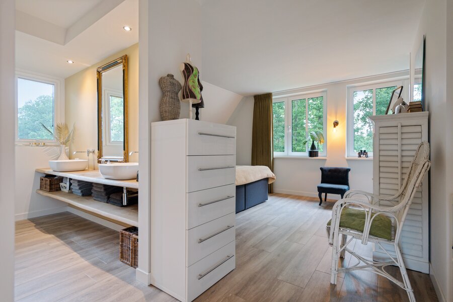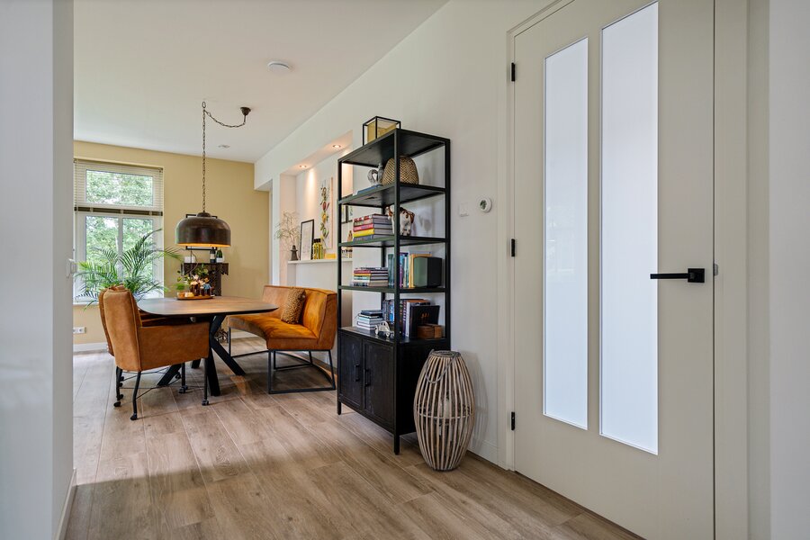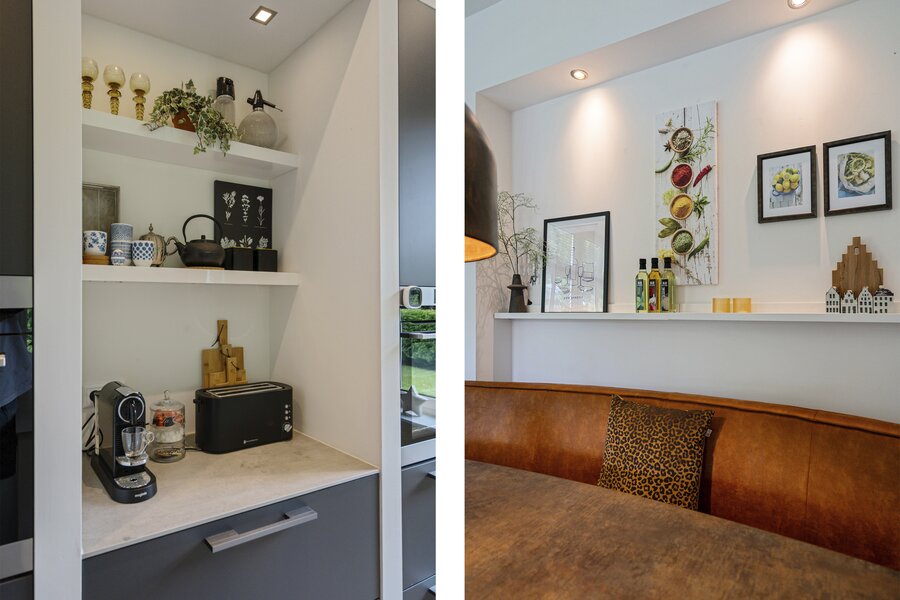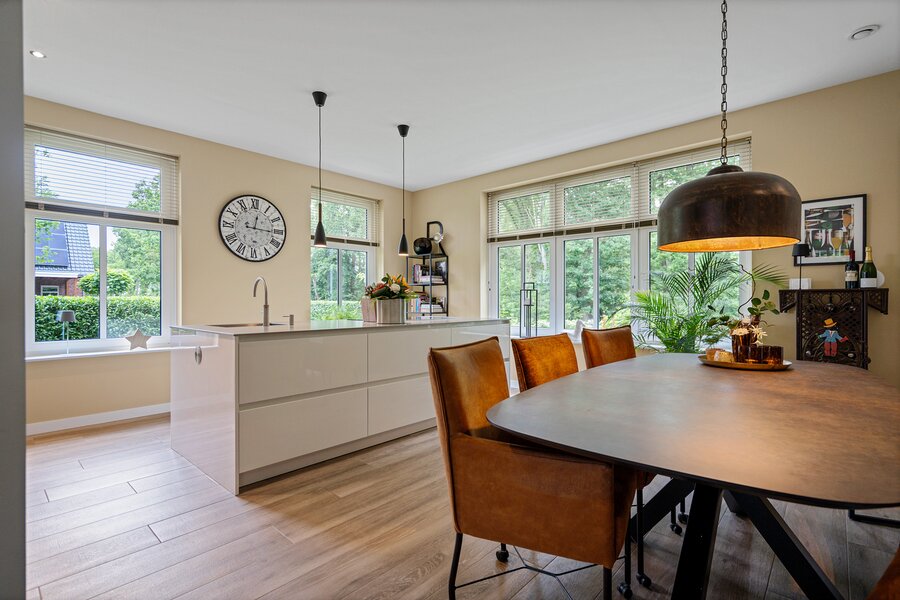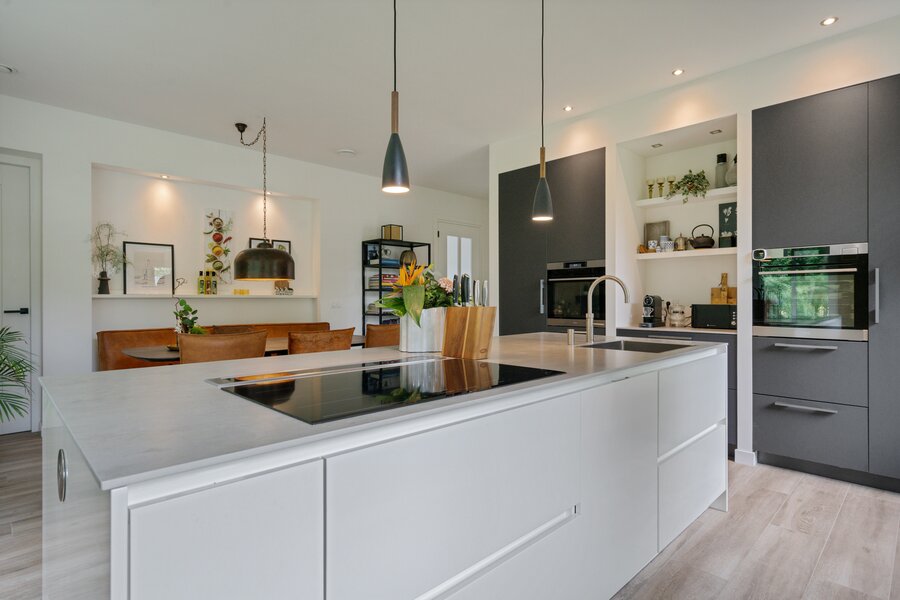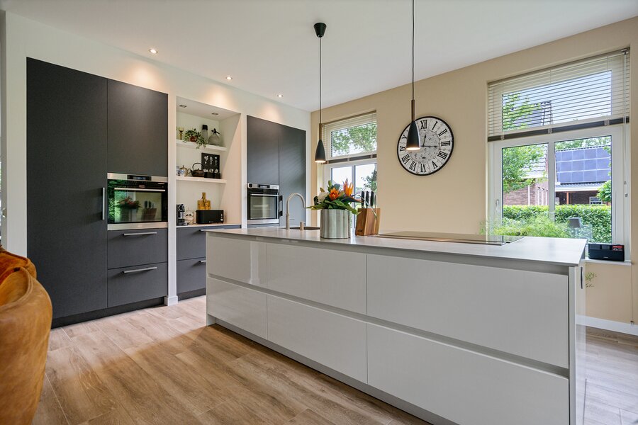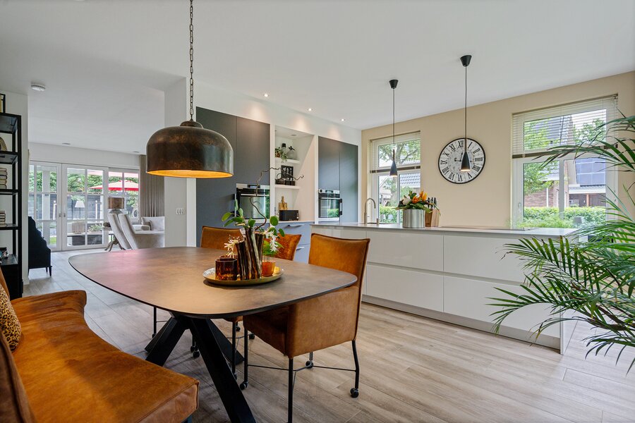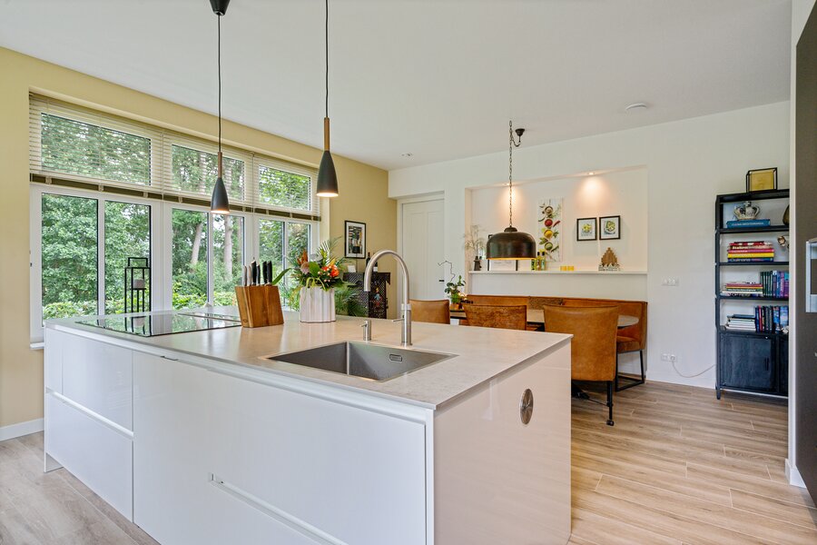 De aangrenzende leefkeuken is een ware eyecatcher, uitgerust met een stijlvol kookeiland en hoogwaardige inbouwapparatuur waaronder een Quooker, inductiekookplaat met downdraft afzuiging, vaatwasser, stoomoven, heteluchtoven en een koelkast. De riante opbergruimte maakt deze keuken bovendien praktisch in gebruik. Door de vele lichtinval is het ook fijn om hier aan de eettafel even lekker een krant te lezen of een kop koffie te drinken.