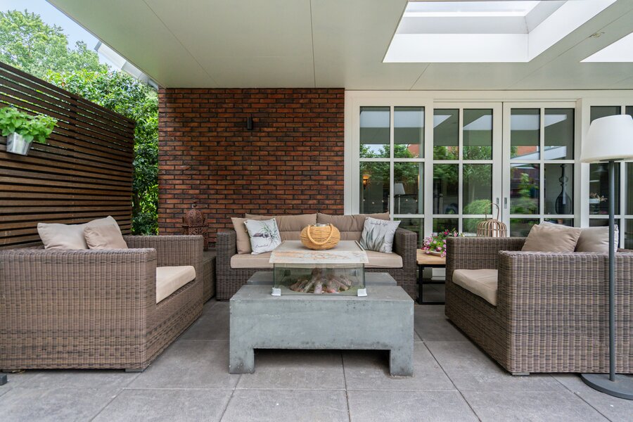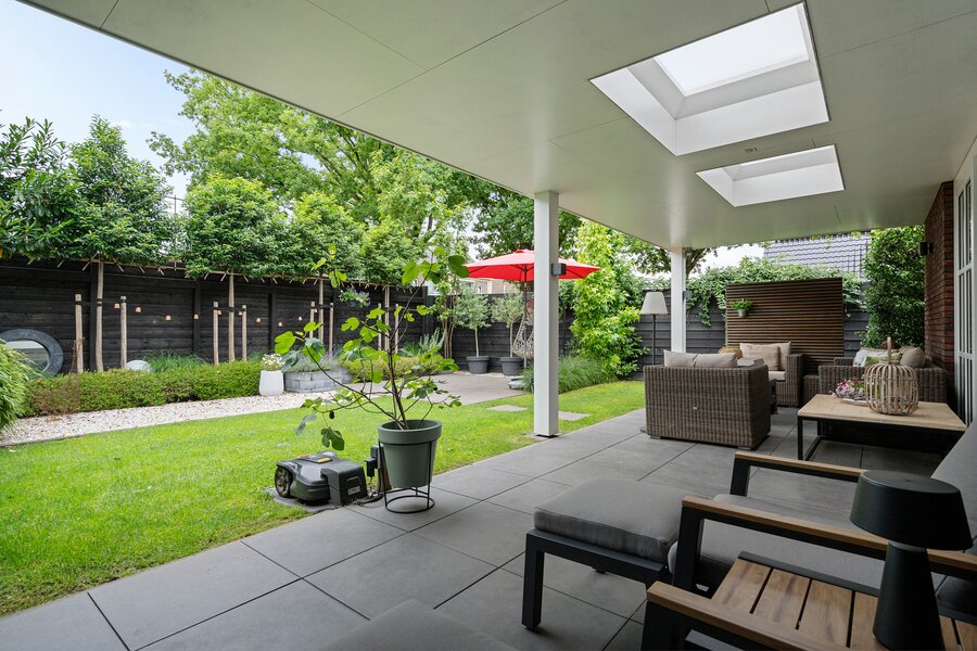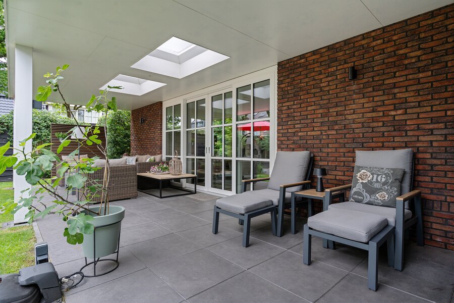 Door de veranda - met 2 lichtkoepels - over de volle breedte van de woning ontstaat een heerlijke verbinding tussen binnen en buiten en deze geeft de mogelijkheid lange avonden buiten te leven. Eventueel is hier ook een serre van te maken.